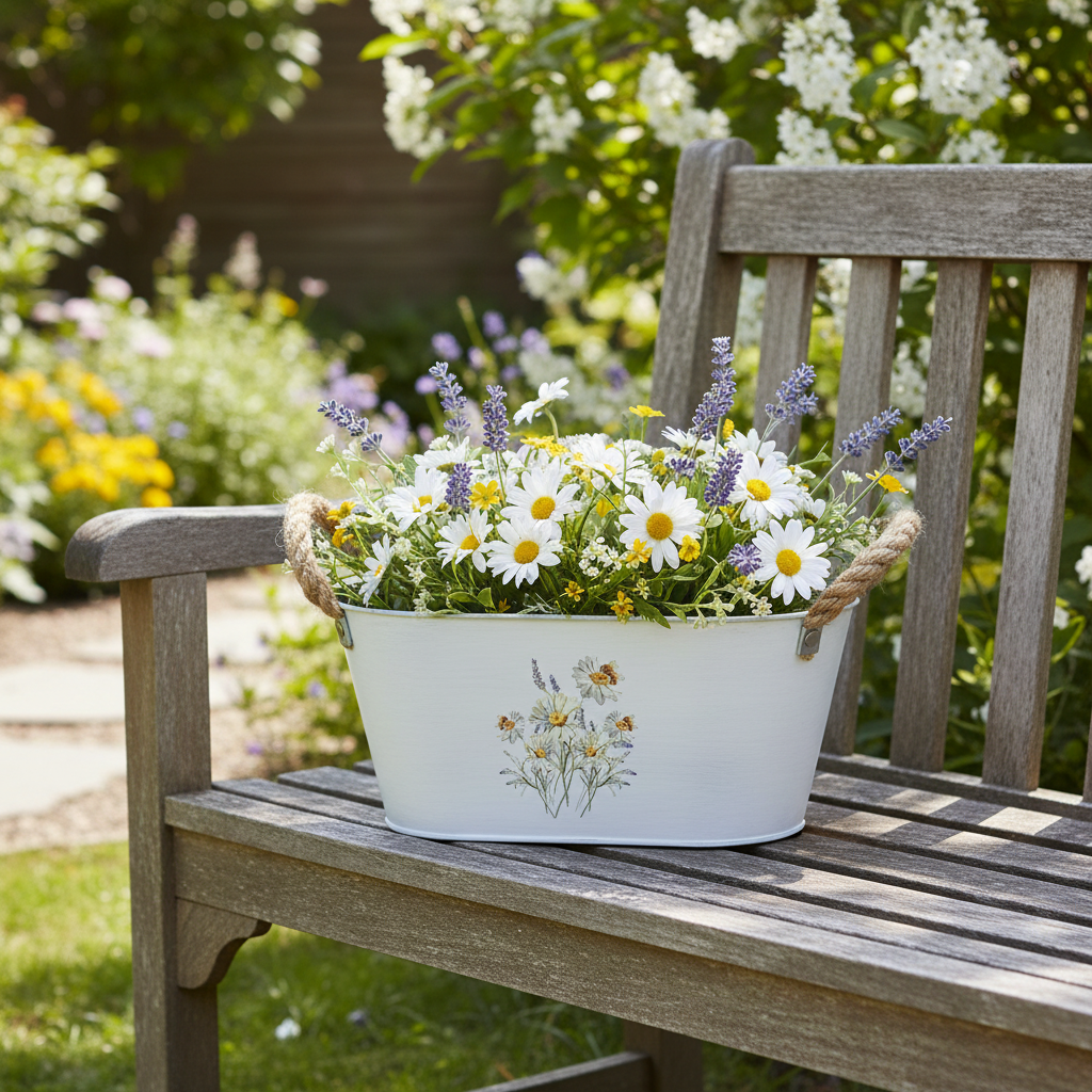 Bruk det vakre plantebrettet som base for ditt neste sommerarrangement eller plant innendørs- eller balkongblomster med en gang. For ekte blomster anbefaler vi å legge dem ut med folie og utvidet leire som drenering.