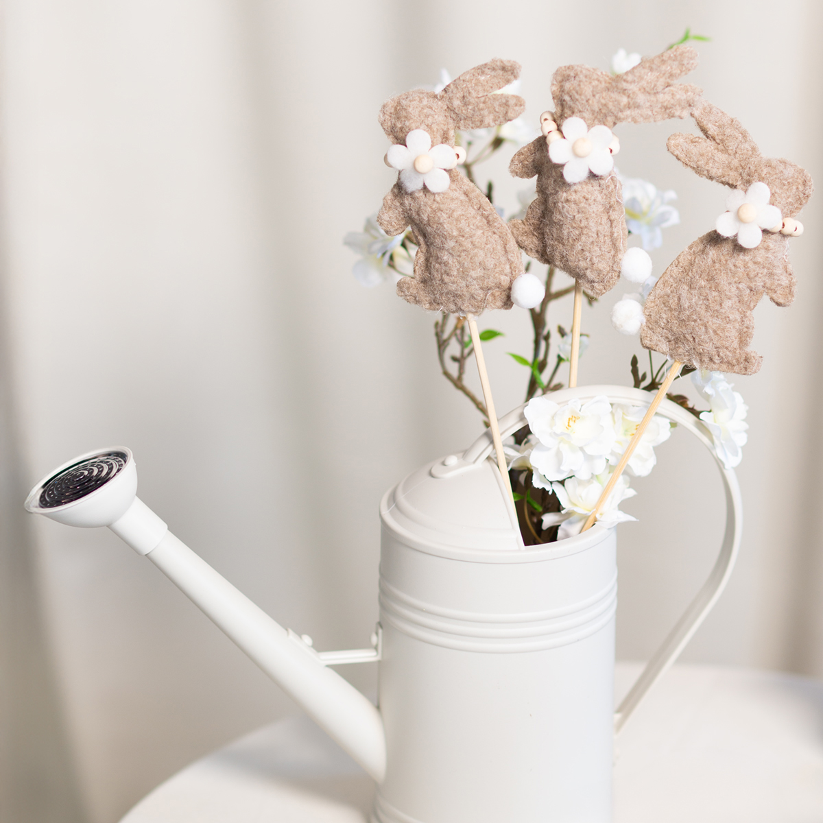 Denne påskeharepynten er et sant høydepunkt for kreative dekorasjonsentusiaster. Figurene er laget av høykvalitetsfilt i en varm brun tone som utstråler naturlighet og hygge. De sjarmerende detaljene, som den delikate blomsten og den lille, fluffy halen, gir kaninene en spesiell appell. Den robuste pinnen gjør det enkelt å arrangere kaninene i vaser, plantede potter eller blomsteroppsatser. De som foretrekker minimalistisk eller skandinavisk design, vil elske den diskrete, men likevel uttrykksfulle stilen til disse figurene.