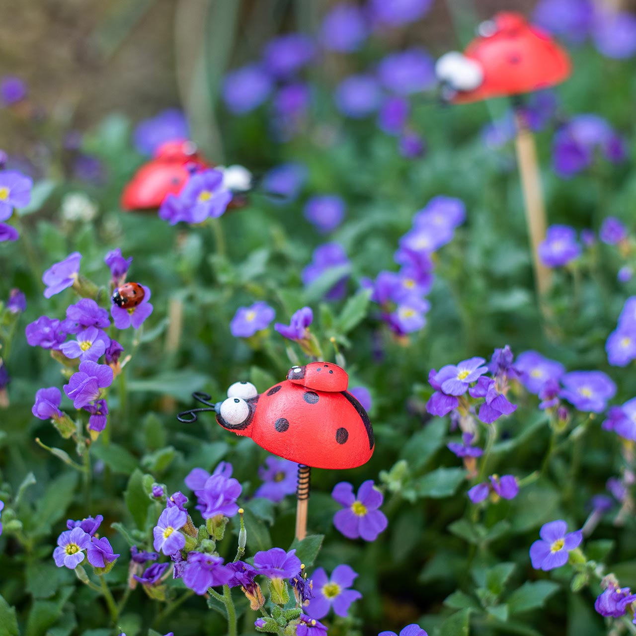 Dekorativ plugg marihøne på pinne tre rød, sort 4cm x 2,5cm H23,5cm 16 stk.