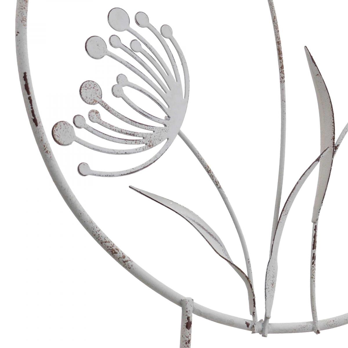 Blomstermotivet på den dekorative ringen har en nostalgisk effekt. Kanskje skyldes dette inntrykket av displayet de smart plasserte, små aksentene i rustfarge som skaper det shabby utseendet. Fordi den stiliserte rylliken til denne metalldekorasjonen er designet i moderne former. Trebasen ble vasket hvit for å matche den dekorative ringen.