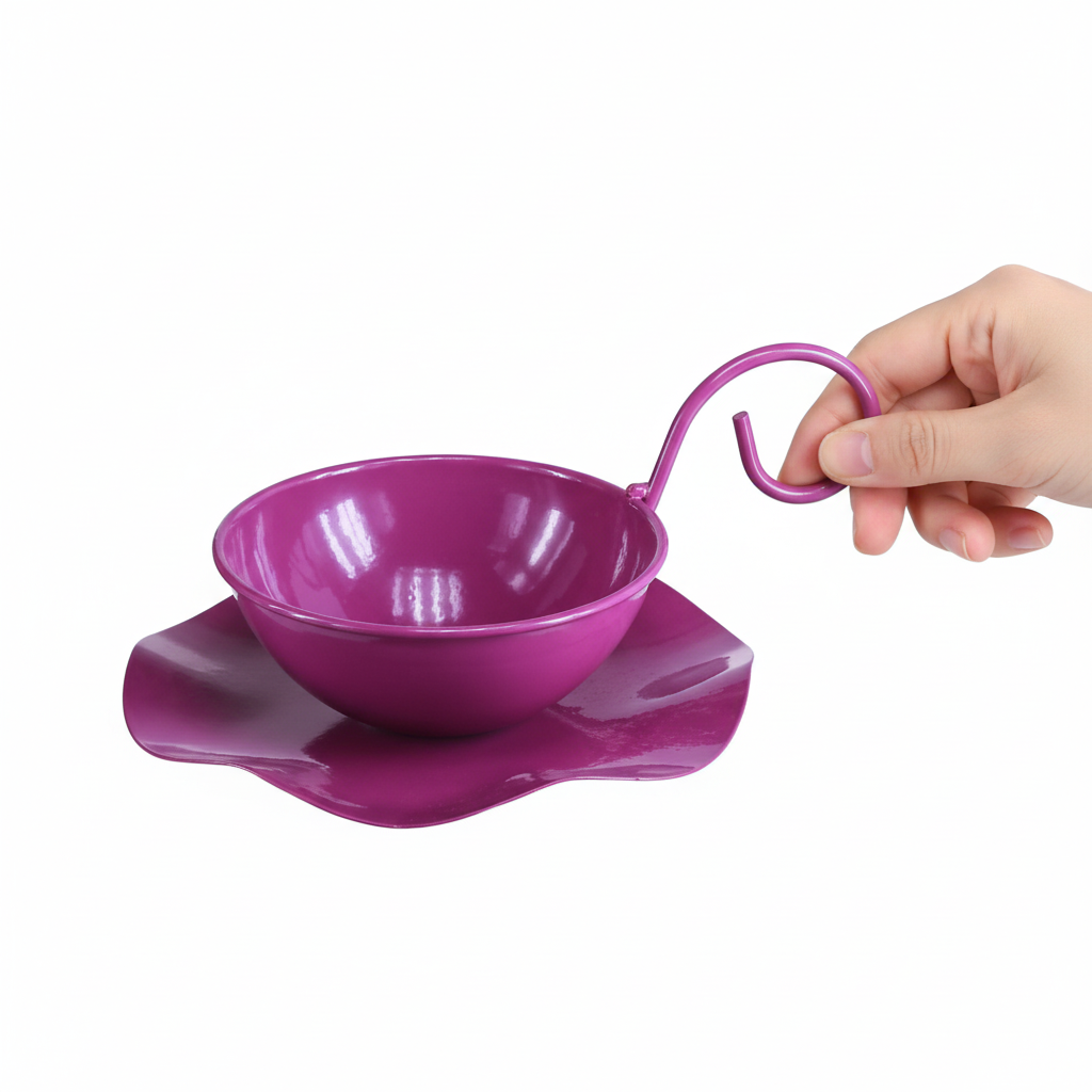 Gled blomstene dine med den lilla dekorative koppen i metall. Denne tekoppen vil sette farge på dekorasjonen din som en blomsterskål om våren og sommeren! Med en åpningsdiameter på rundt 11,5 cm og en høyde på 8 cm er den ideell for en rekke dekorative formål - både innendørs og i sommerhagen. Den lilla fargen utstråler en mystisk eleganse og harmonerer perfekt med naturlige pastelltoner eller sterke aksentfarger, noe som åpner for mange kreative designmuligheter. Spesielt bemerkelsesverdig er det elegant buede håndtaket og den bølgete blomsterformede tallerkenen festet til koppen, som ikke bare er visuelt tiltalende, men også funksjonelt imponerende. Denne lilla lakkerte dekorative koppen kommer i sett med to og er et absolutt must for alle som ønsker å berike omgivelsene sine med smakfulle aksenter.