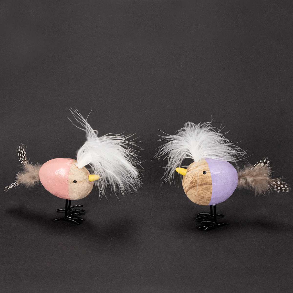 Hver av våre dekorative fugler er laget av ekte tre med omhyggelig oppmerksomhet på detaljer. De delikate, ekte fuglefjærene gjør hvert stykke unikt og gir det en naturlig sjarm. Disse dekorative trefuglene måler 10 cm i lengde, 3 cm i bredden og 9 cm i høyden, og er perfekte for et dekket bord eller, om våren, for en vinduskarm. Kombinasjonen av lilla og rosa skaper en myk og munter atmosfære – ideelt for å fremme en innbydende og gledelig atmosfære.