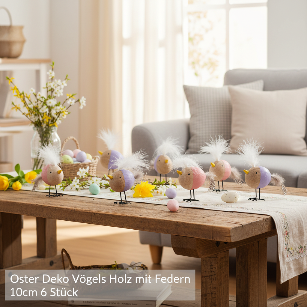 Kombinasjonen av naturlig treverk, fint håndverk og livlige farger gjør dette dekorative settet virkelig spesielt. Disse små fuglene er ikke bare enkle å plassere, men også utrolig allsidige. Pakket som et sett på seks, er de ideelle for å bringe dekorasjonsideene dine til live. Oppdag de mange mulighetene: en fargerik aksent på påskebordet ditt, det perfekte supplementet til vårdekorasjonene dine, eller en omtenksom gave til dine kjære.
