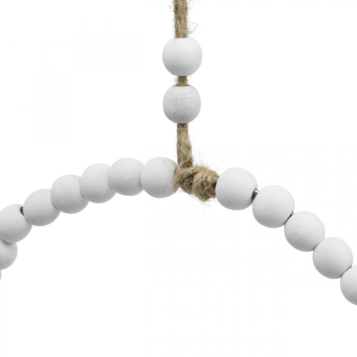 Den dekorative bøylen består av mange treperler trukket på metalltråd som er farget matt hvit og delvis lar den naturlige tretonen skinne gjennom. I tillegg kan perleringen formes variabelt takket være ledningen på innsiden og er utstyrt med en jutesnor for oppheng.