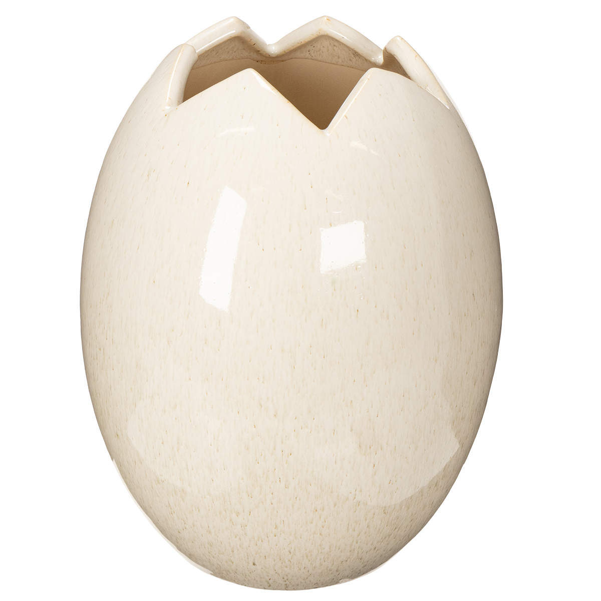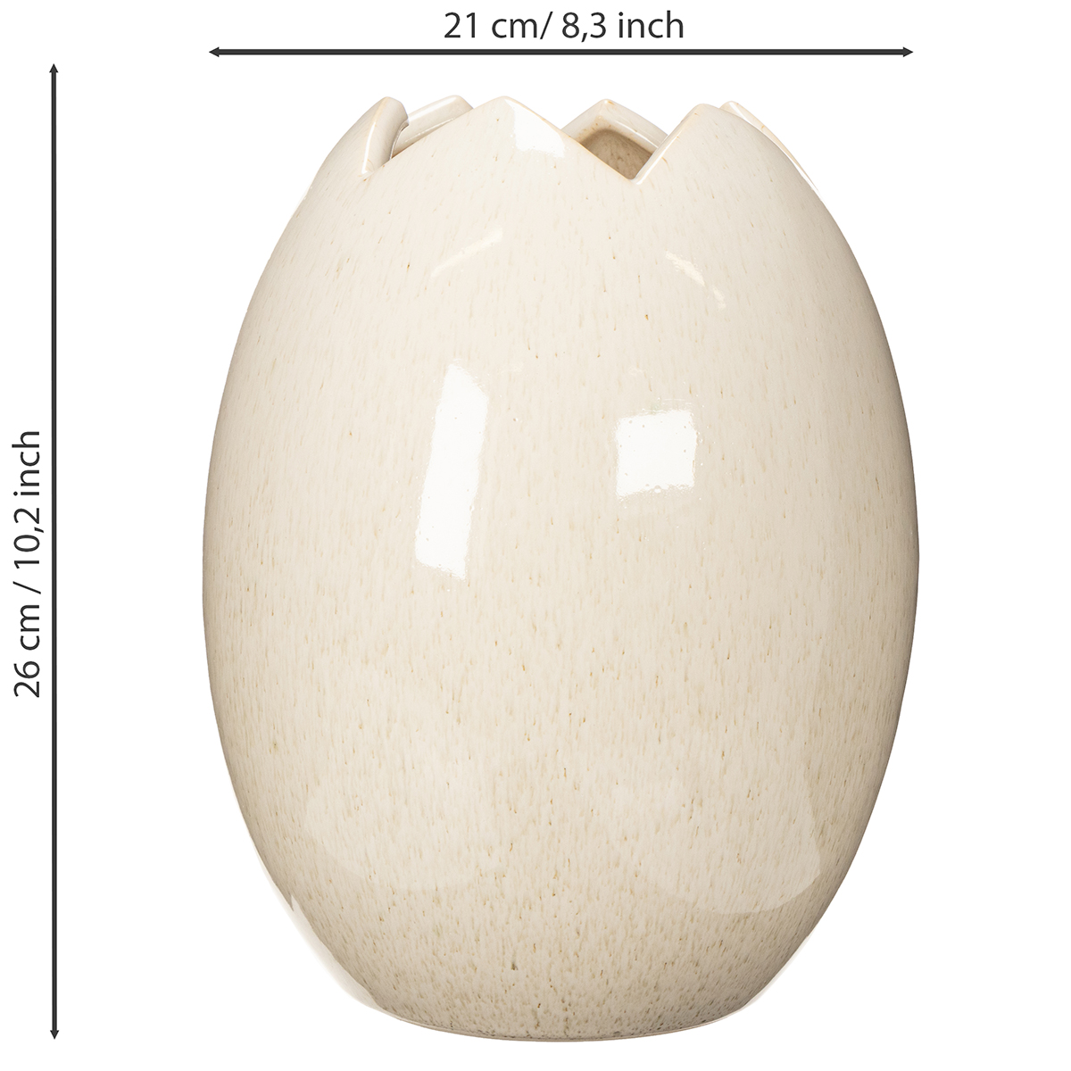 Denne eggformede dekorative vasen kombinerer moderne design med allsidig funksjonalitet. Med sine mål (26 cm høy, 21 cm i diameter) og keramisk materiale av høy kvalitet, passer den sømløst inn i ulike oppholdsrom. Den elegante, flekkete hvite finishen utstråler en diskré eleganse som aldri er påtrengende. Den sprukne «eggeskall»-effekten i den øvre kanten gjør den til et skikkelig blikkfang.