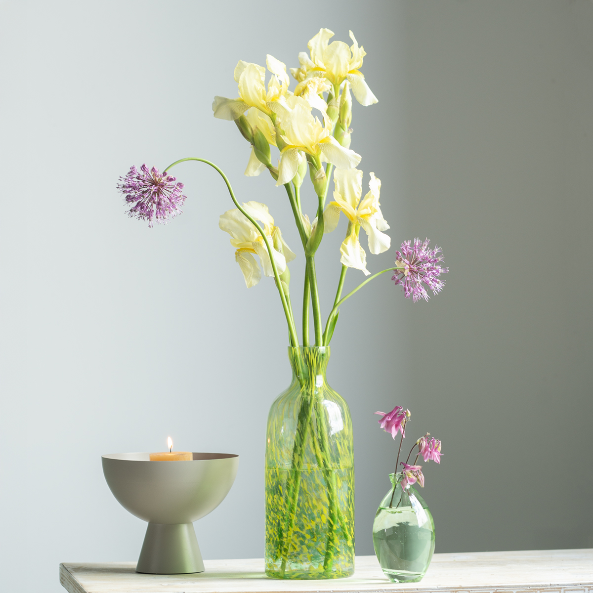 Men selvfølgelig kan du stille ut blomster og blomsterdekorasjoner i glassvasen. Det gulgrønne harmonerer naturlig med bruntoner som dekorative grener, men også med oransje blomster som valmuer.