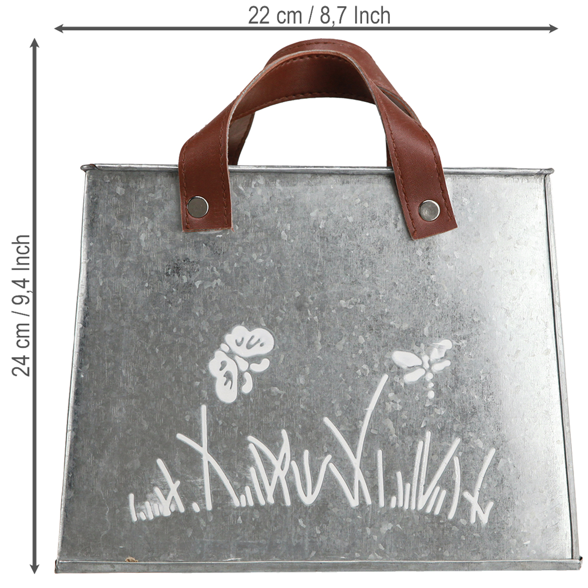 Våre sølvfargede dekorative metallvesker kombinerer funksjonalitet og design på en ekstraordinær måte. Disse plantekassene er ideelle for dekoratører, kreative hoder og alle som ønsker å legge til et snev av eleganse til hjemmet sitt. Med et hvitt motiv av sommerfugler og gress på begge sider og de brune håndtakene i kunstskinn får du et produkt som egner seg både som plantekrukke og som dekorativt element på balkongen eller bordet. Denne dekorative plantevesken fremhever den rustikke sjarmen og passer vakkert sammen med andre vintagedekorasjoner. Gi hjemmet ditt et personlig preg med disse ekstraordinære metallplantepottene, som imponerer med sin enkle, tidløse eleganse.