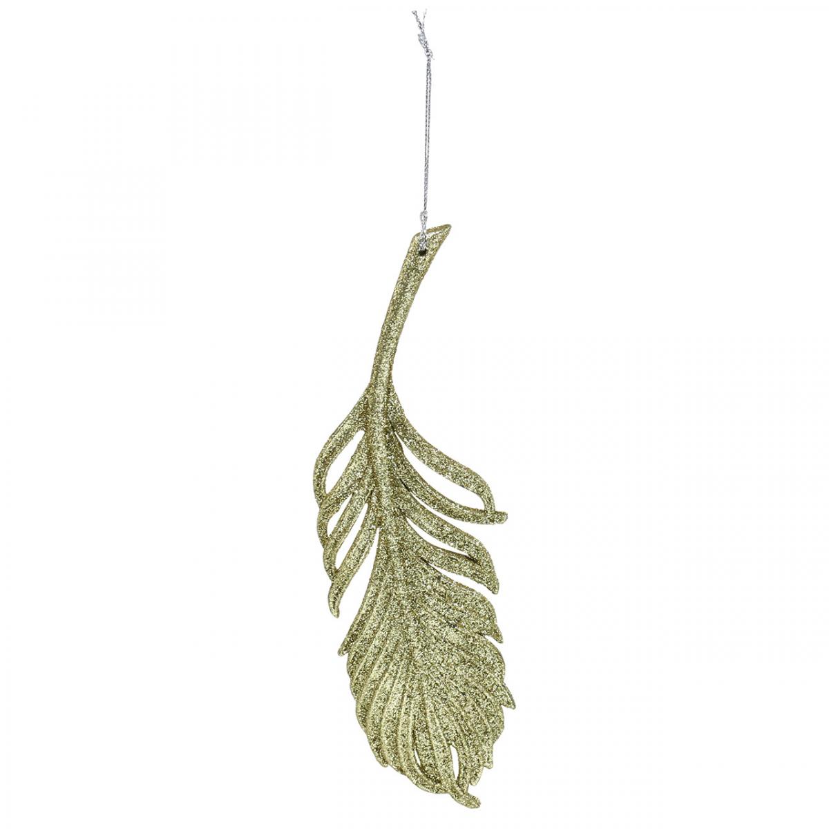 Produktnavn: Dekorative fjær, trepynt med glitter, adventsdekorasjoner, fjær til å henge gylden L22cm 12stk.