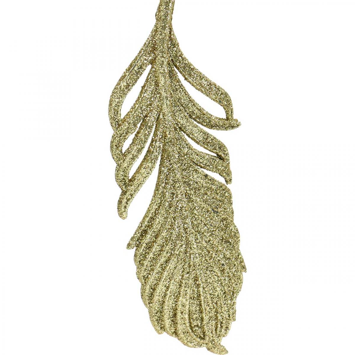 Dekorative fjær, trepynt med glitter, adventsdekorasjoner, fjær til å henge gylden L22cm 12stk.