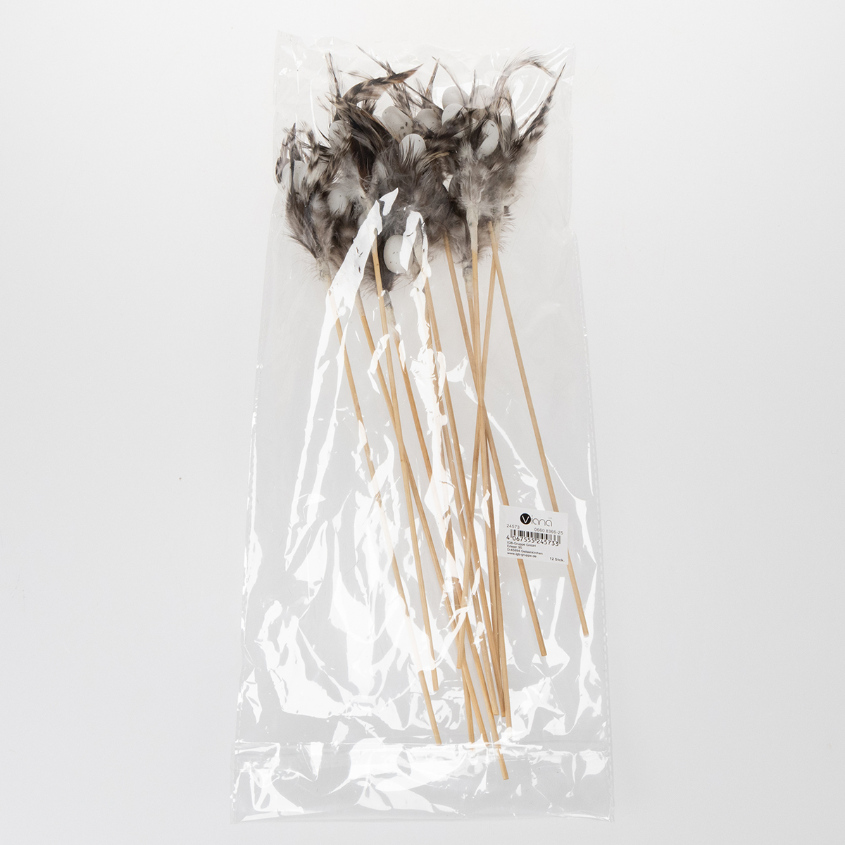 Produktnavn: Dekorative fjærgrenpinner med naturlige fjær, påskedekorasjon for elegante arrangementer, 37 cm, 12 stk.