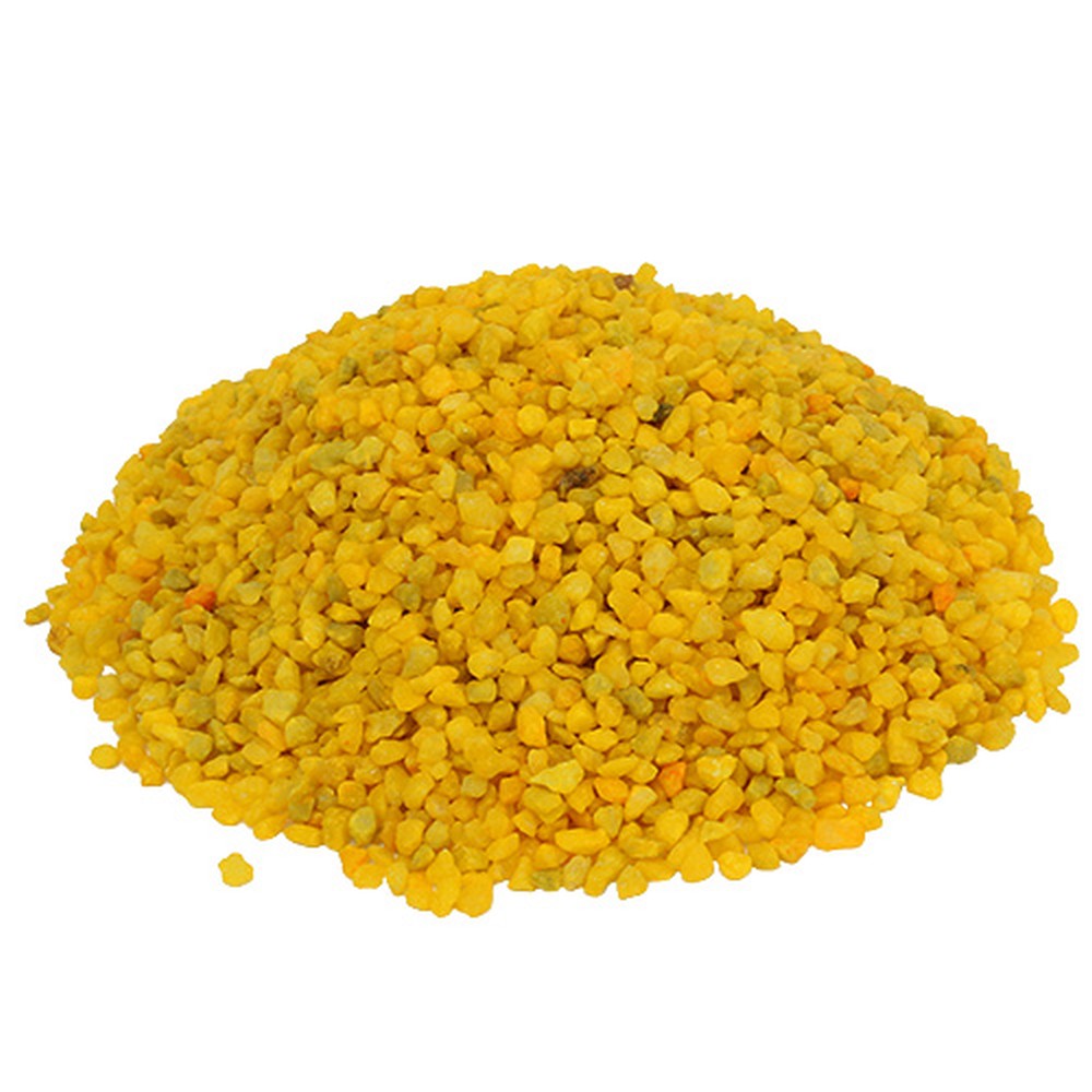 De gule dekorative granulatene består av små rullesteiner og leveres i en pose som inneholder 2 kilo. Steinene er omtrent 2 til 3 millimeter store.