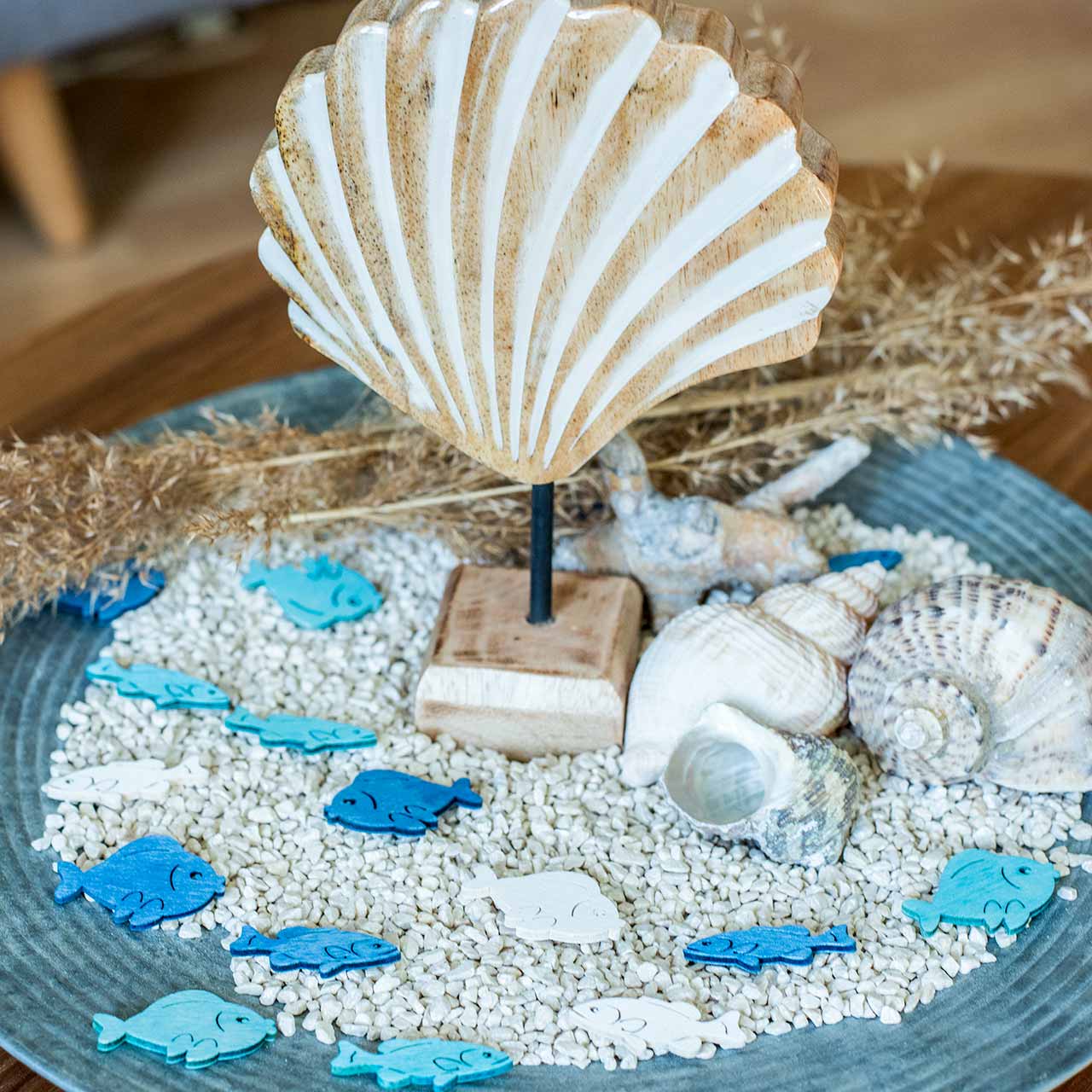 En effektiv kombinasjon er med maritime gjenstander som skjell, sjøstjerner, drivved og elvestein, som du kan fylle inn i en pæreformet glassvase eller arrangere på et vintage trebrett. En stemningsfull dekorasjon til badet eller balkongen!