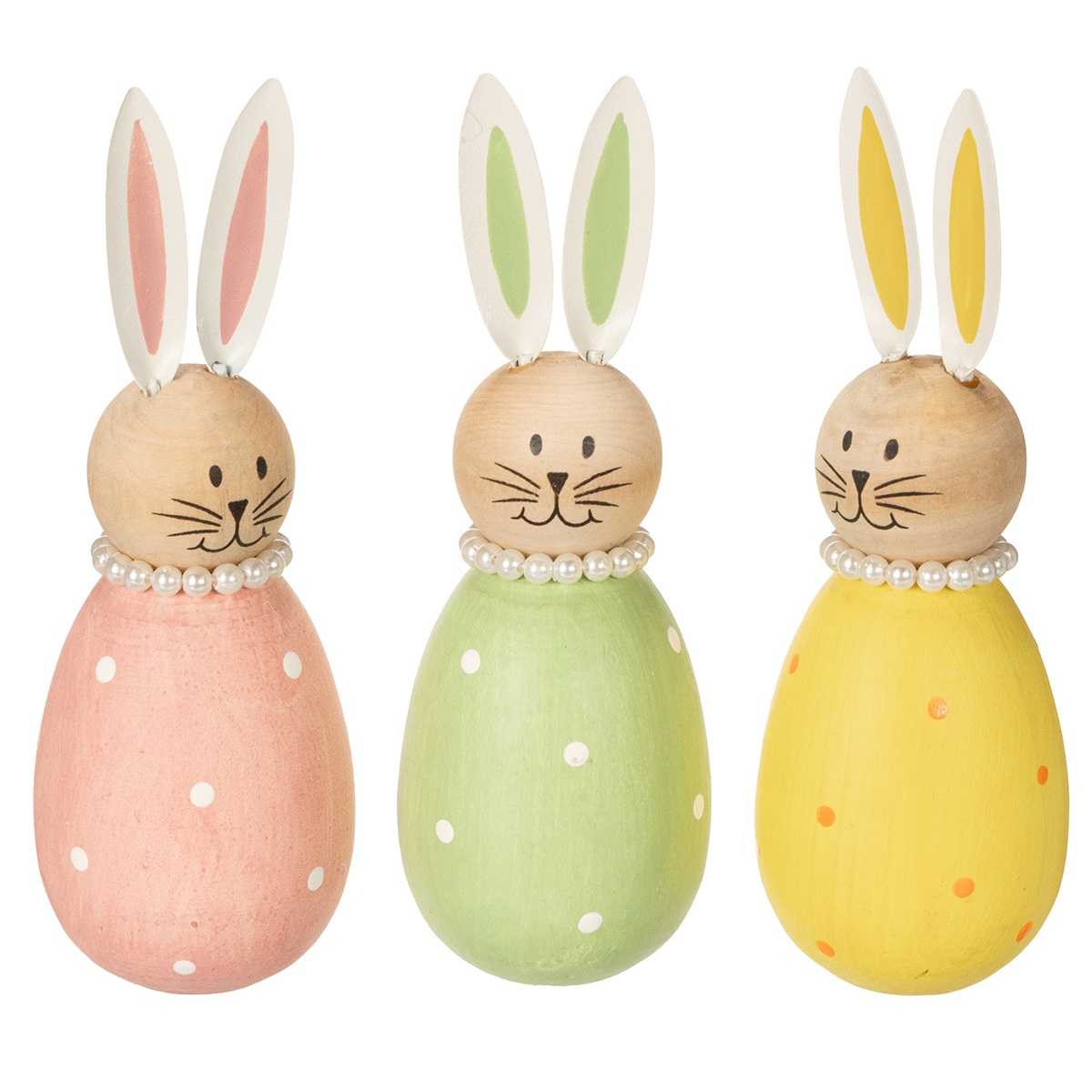 Dekorative kaninfigurer i pastelltre, påskeharer med perlekjede, 14,5 x 5 cm, 3 stk.