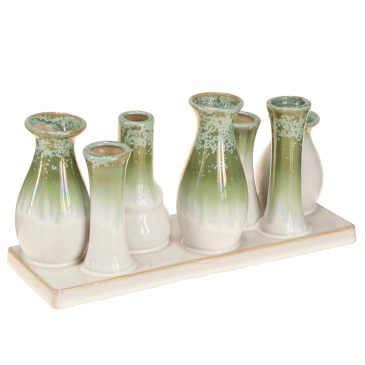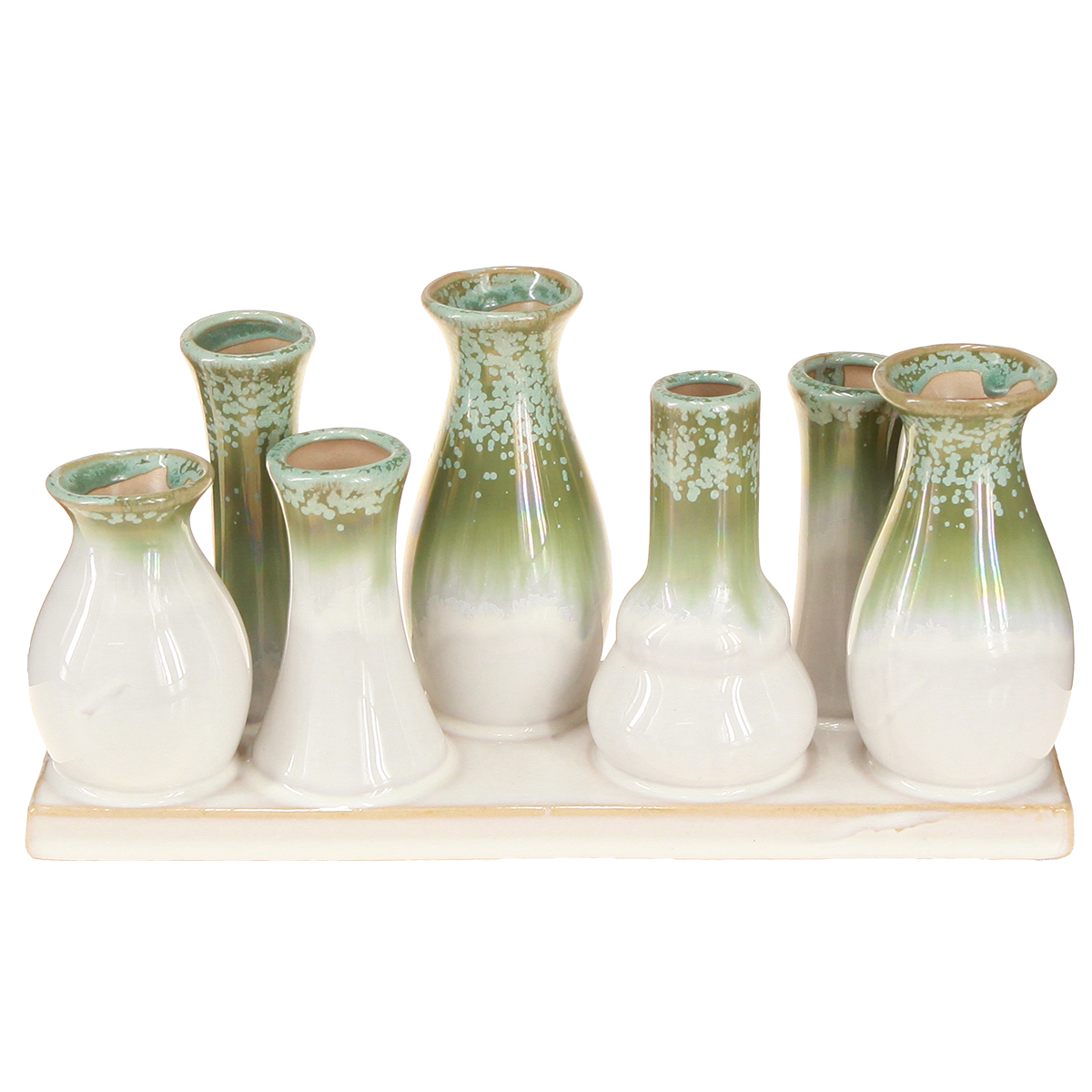 Dette settet med sju små dekorative keramiske vaser på et fargekoordinert brett vil raskt bli et høydepunkt i interiørdesignet ditt. De harmoniske grønne og hvite tonene fremkaller naturen i skandinavisk design og komplementerer minimalistiske eller rustikke stiler perfekt. Vasene er formet på forskjellige måter, noe som gir visuell interesse til kremfargen. Enten de er arrangert som en gruppe eller plassert individuelt, tilbyr dette settet utallige designmuligheter.
