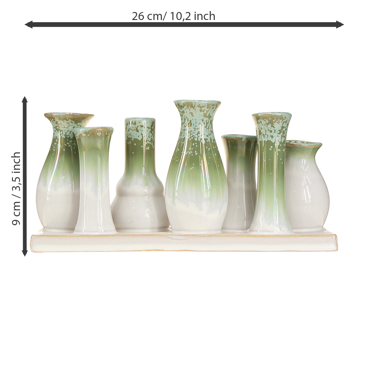 Når var sist gang du forbedret hjemmet ditt med gjennomtenkte detaljer som gir et spesielt preg? Vårt dekorative keramiske vasesett på et høykvalitetsbrett er det perfekte tilbehøret til hjemmet! Disse vakre minivasene i myke nyanser av grønt og hvitt kombinerer eleganse med tidløs enkelhet – perfekt for et harmonisk hjem. Med en lengde på 26 cm og et rustikt utseende passer disse vasene perfekt inn i ethvert rom, enten det er spisebordet, vinduskarmen eller gangen.