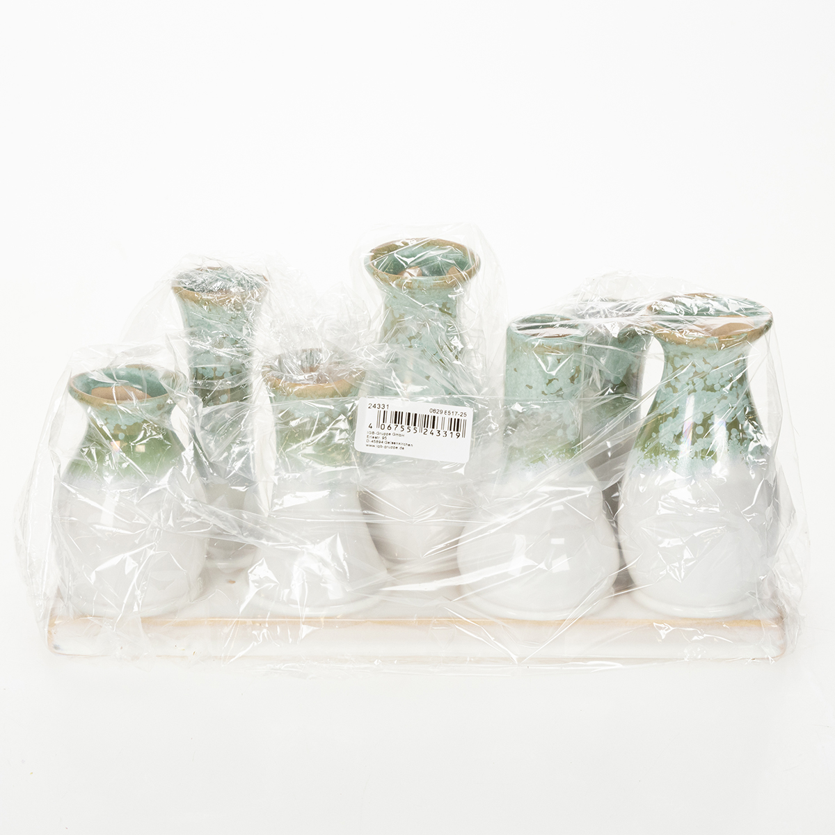 Dette settet med sju små dekorative keramiske vaser på et fargekoordinert brett vil raskt bli et høydepunkt i interiørdesignet ditt. De harmoniske grønne og hvite tonene fremkaller naturen i skandinavisk design og komplementerer minimalistiske eller rustikke stiler perfekt. Vasene er formet på forskjellige måter, noe som gir visuell interesse til kremfargen. Enten de er arrangert som en gruppe eller plassert individuelt, tilbyr dette settet utallige designmuligheter.
