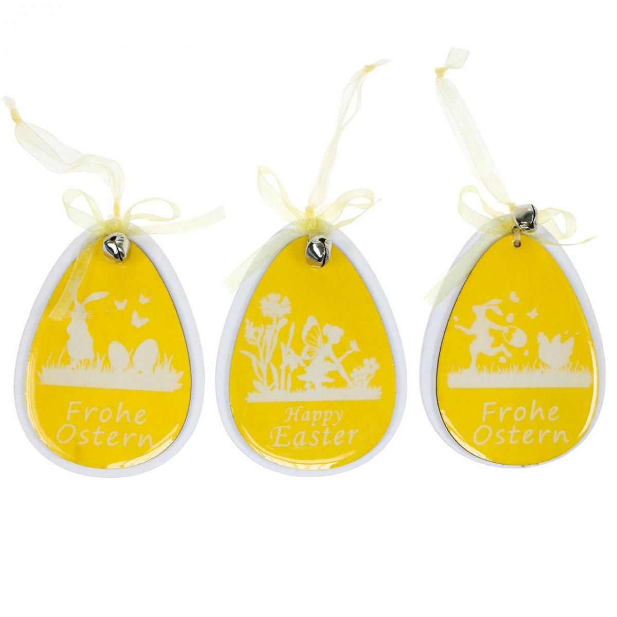 Tredekorasjonen består av den hvite silhuetten av et påskeegg, som holdes sammen av hengeren med en mindre i gul. Et vårlandskap er trykt i hvitt på det blanklakkerte gule anhenget, der en alv kneler ned for å la en sommerfugl hvile på hånden. Ønsket "God påske" følger med det nostalgiske påskemotivet. En liten sølvklokke og et sitrongult, gjennomsiktig bånd fullfører den stemningsfulle påskedekorasjonen fra kvalitetsmerket VIANA.
