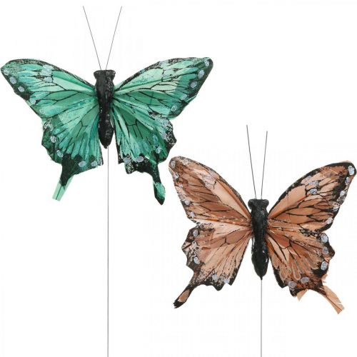 Dekorative sommerfugler, vårpynt, fjærsommerfugler, planteplugger grønn, brun 9,5×12,5cm 12stk