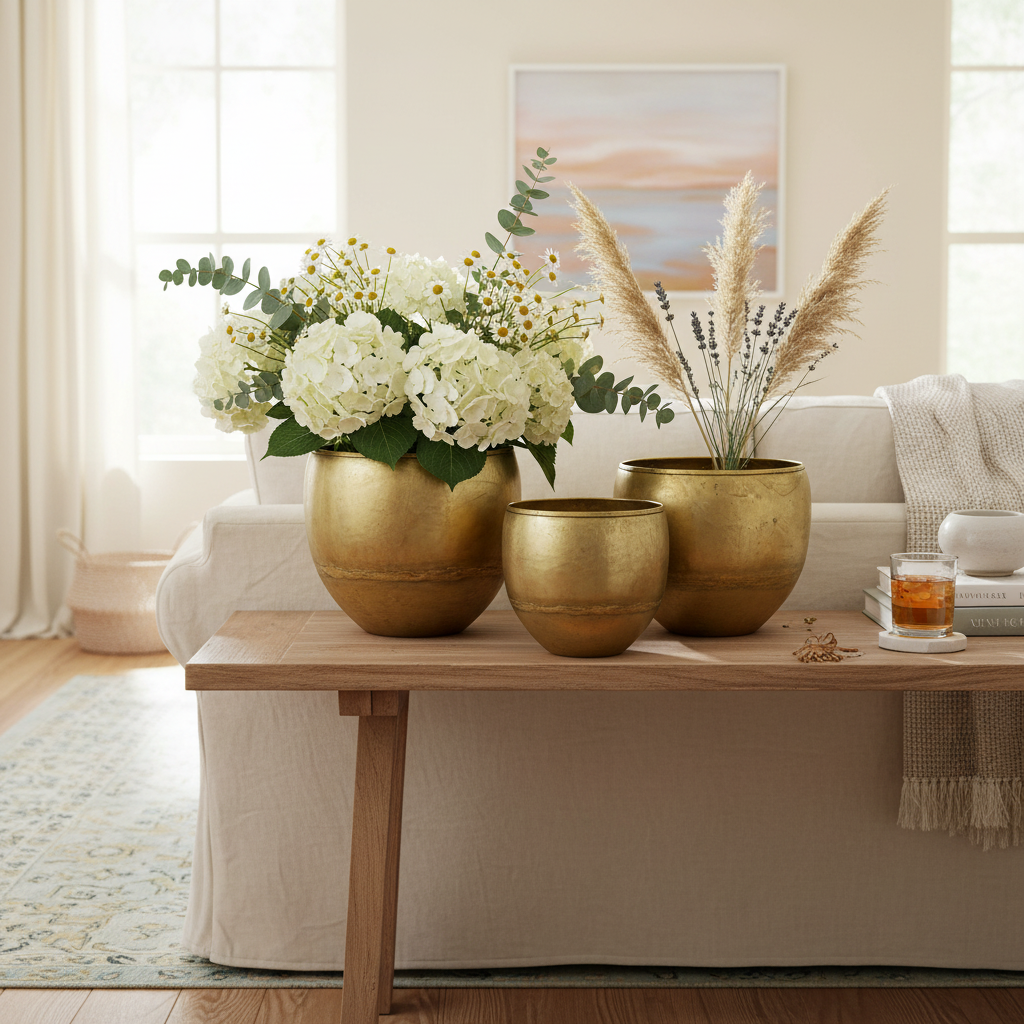 Dekorative vaser i messinglook i metall Ø18/15/12,5 cm, sett med 3
