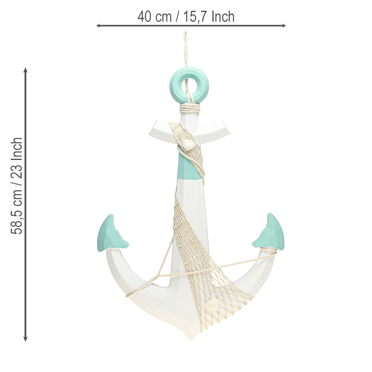 Vårt dekorative anker i hvitt og lyseblått kombinerer stilig maritim eleganse med tidløs skjønnhet. Denne maritime dekorasjonen imponerer med sin harmoniske fargekombinasjon og bomullsdekoren, som er dekorativt vevd rundt ankeret som et fiskenett og tau, samt de vedlagte skjellene. Med en størrelse på ca. 58,5 cm er ankeret et slående blikkfang som ser perfekt ut i stuen, badet eller hagen. Bomullshengeren av høy kvalitet gjør det enkelt å feste til veggen eller taket, slik at du kan gi hjemmet ditt en frisk, maritim stil på kort tid.