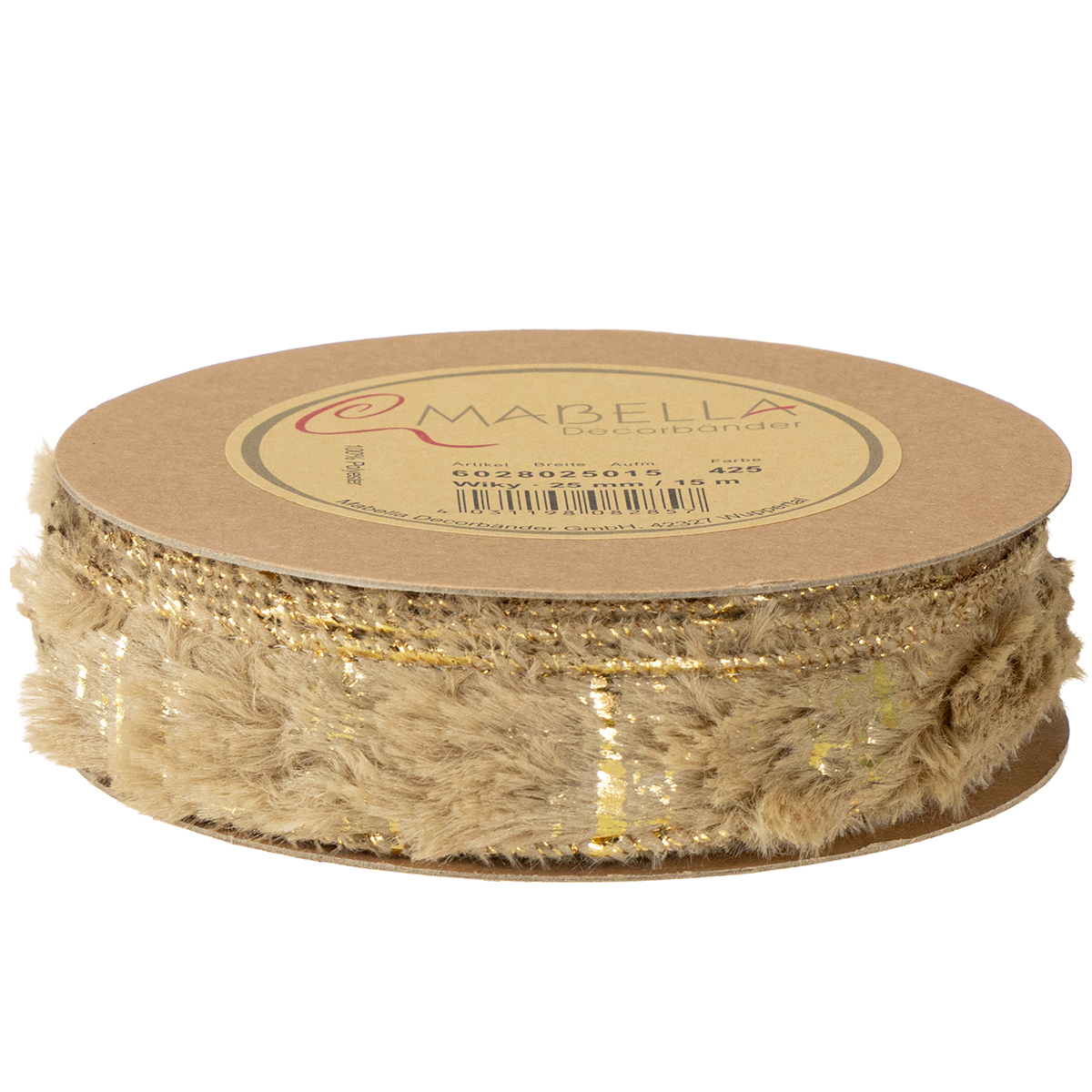 Dekorativt bånd med pels, fuskepelsbånd, brunt gull, 25 mm, 15 m