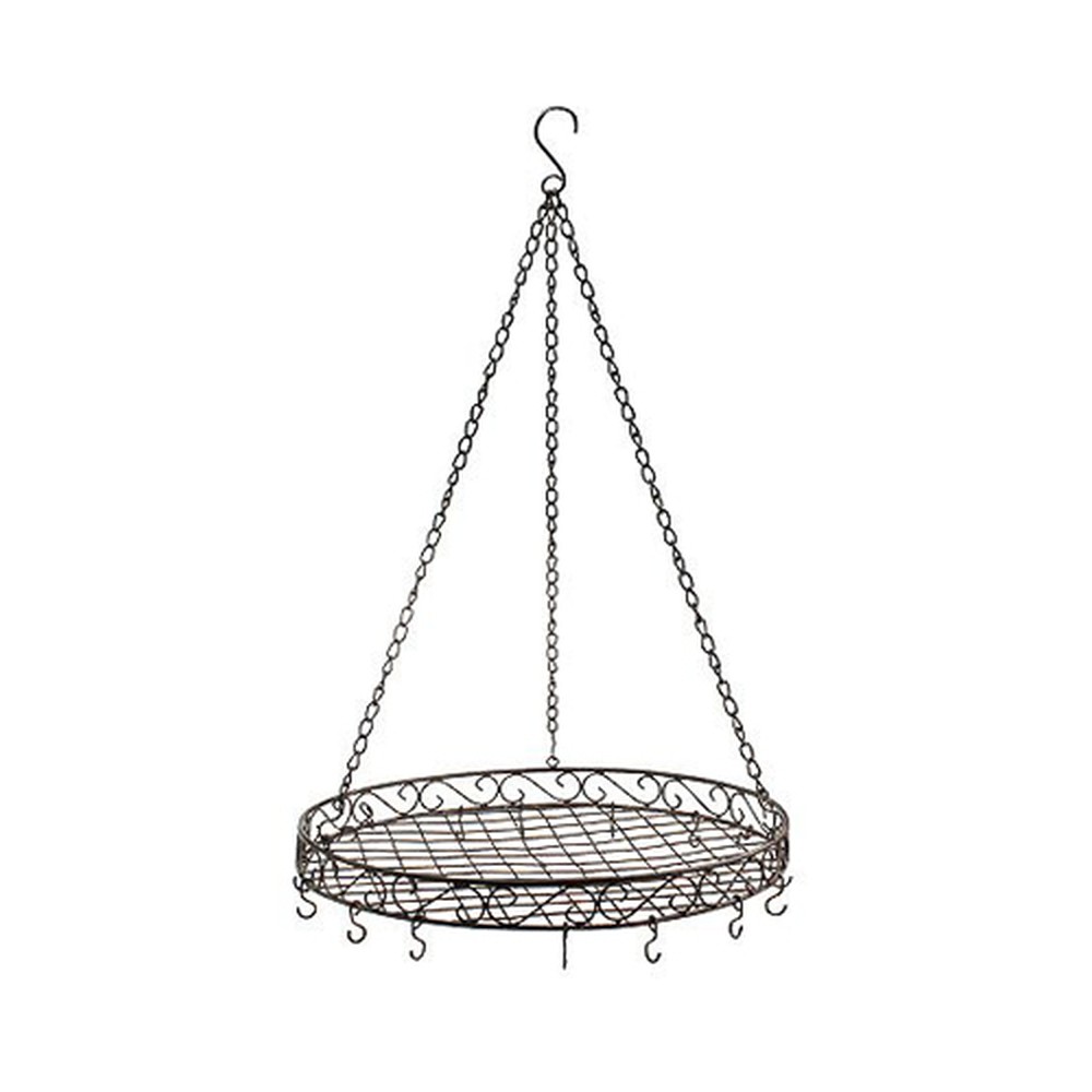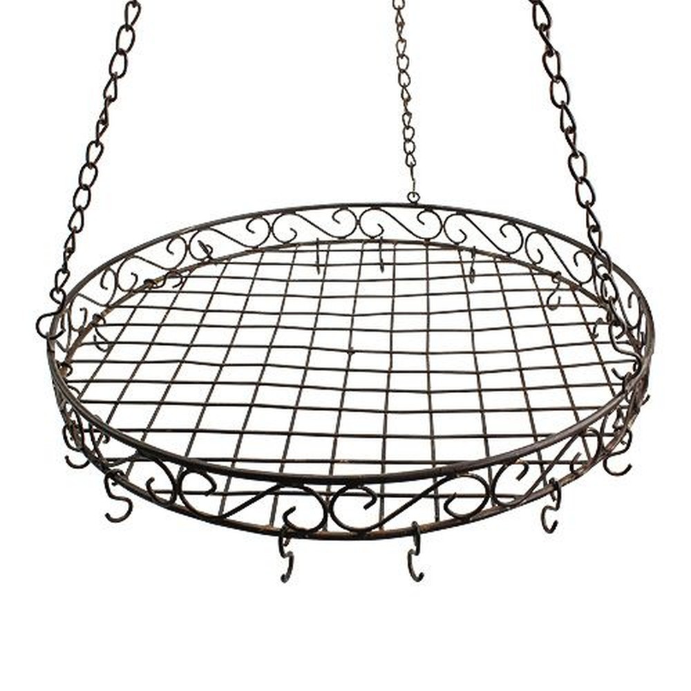 Ønsker du å innrede leiligheten din i en elegant herregårdstil og fortsatt trenger en flott dekorasjonsidee for taket ditt? Da er dette dekorative brettet akkurat det riktige valget! Bunnen av brettet består av et gitternett som er festet til en rund metallring med klassiske krøller. Totalt er det festet 12 små kroker til ringen, hvor du for eksempel kan henge en hengende plante, en kjede av lys, kokekar, kniv, tresleiv og en løkpose.