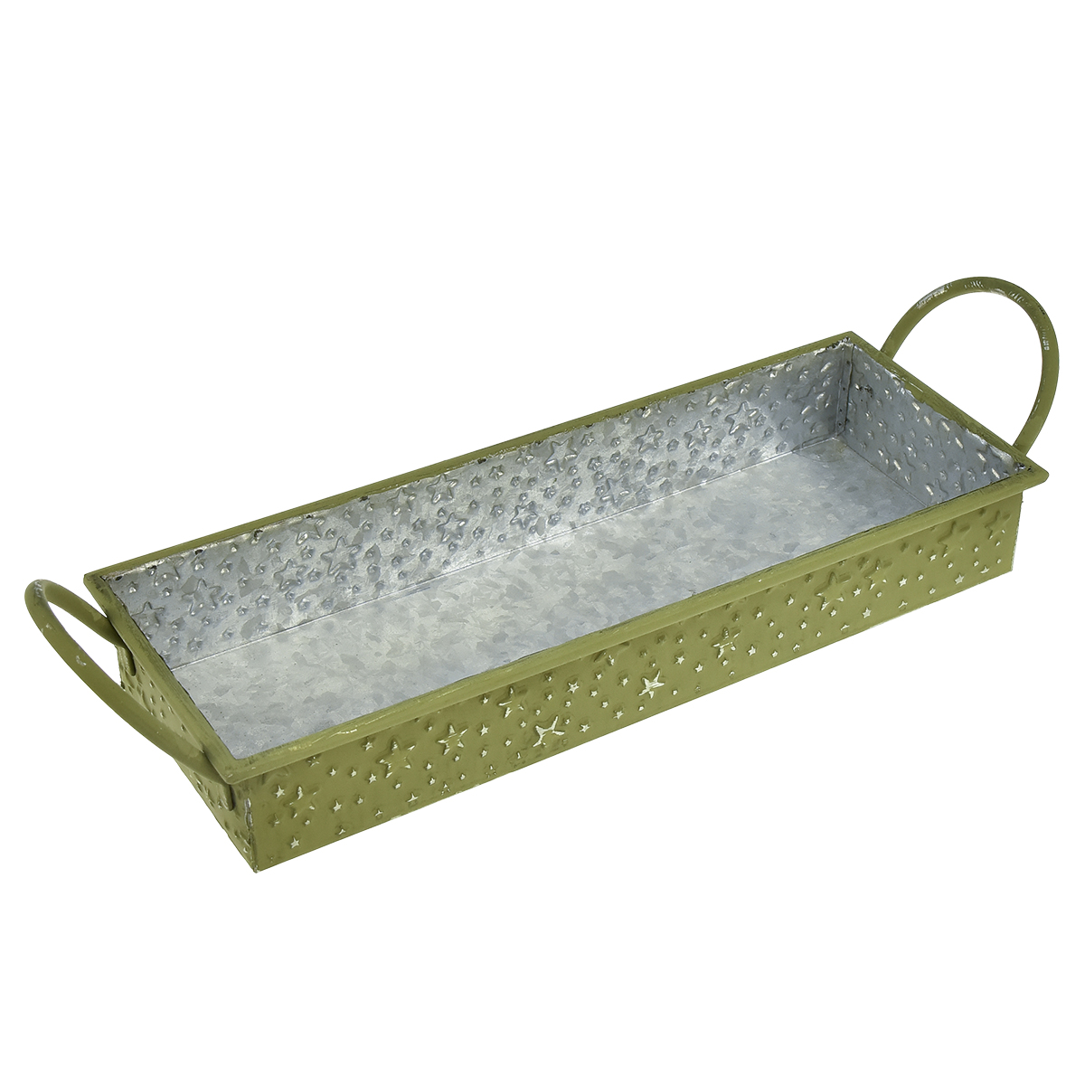 Fullfør julepynten med det sjarmerende juledekorasjonsbrettet i grønt med sølvstjerner. Dette avlange metallbrettet i vintage-look vil lyse opp ethvert hjørne av hjemmet ditt og skape en festlig atmosfære. Ideell for dekoratører og blomsterhandlere, så vel som alle som ønsker å sette stilige detaljer til hjemmet sitt denne julen.
