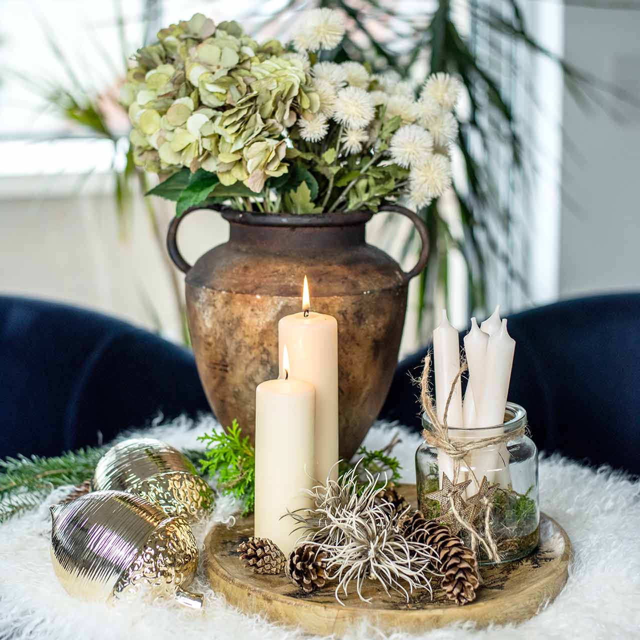 Den massive dekorplaten er i seg selv så vakker at det ikke tar mye å vise den imponerende. Plasser noen få utvalgte tilbehør midt på det runde dekorative brettet: et hjort av gull laget av metall, dekorativ hjort i mystiske mørke farger med gullgevir eller noen glitrende eikenøtter. Hvis du legger spesielt vakre naturlige materialer som grangrønne, tørkede oransje skiver eller kanelstenger på platen, bør dekorplaten definitivt forbli synlig for å få frem mønsteret og kornet. Hvordan designe borddekorasjoner, en skjenk eller en benk i adventstiden på en stemningsfull og festlig måte! Treplaten kan også tas ut til andre festlige anledninger som påske eller bursdag og presenteres igjen og igjen!