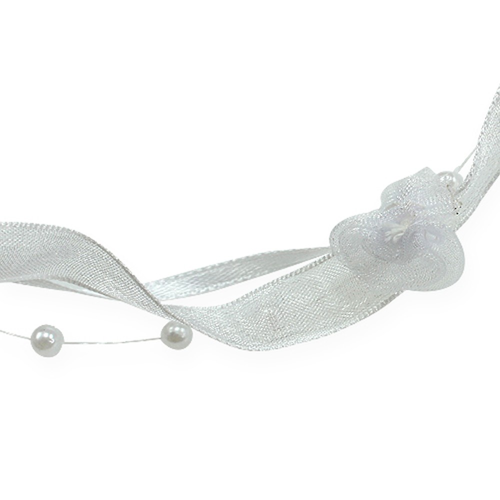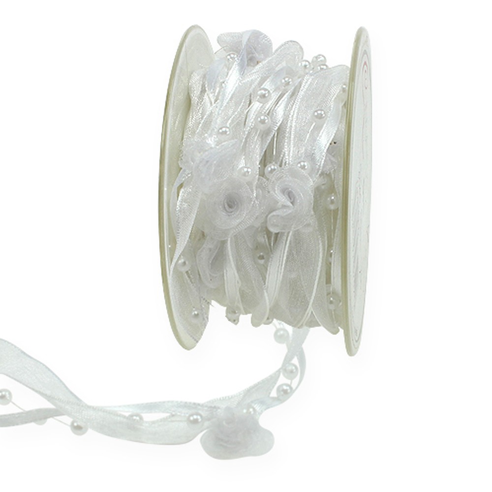 Det hvite dekorative båndet "Valentino" laget av 100% polyester leveres på en plastrulle og er rundt 15 millimeter bredt og rundt 5 meter langt. Mens rosene måler rundt 2 centimeter i diameter, er perlene bare rundt 4 millimeter.