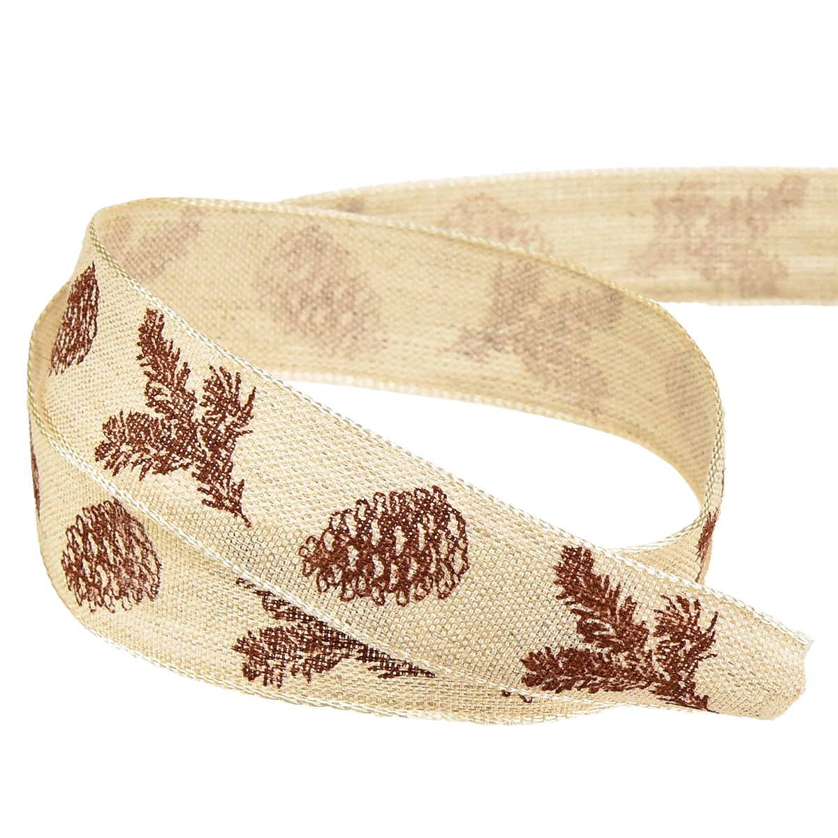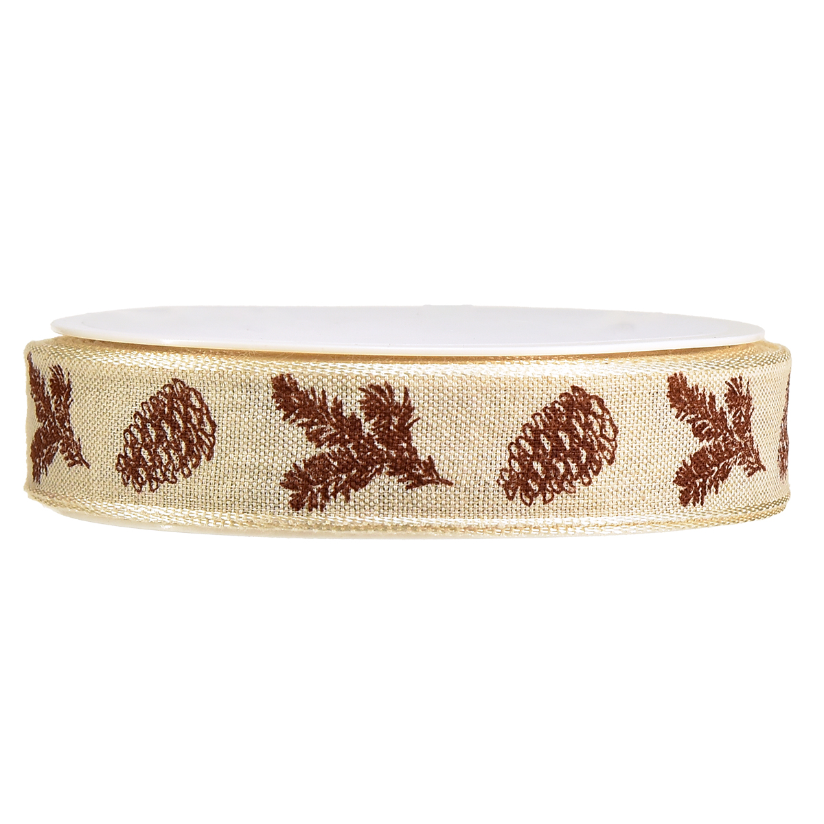 Sett et naturlig og festlig preg på dine gaver og dekorasjoner denne vinteren med vårt kjeglebånd. Dette krem- og brune dekorative båndet med stiliserte konglemotiver er det ideelle valget for alle som foretrekker en varm og rustikk julestemning. Takket være trådkanten kan gavebåndet enkelt formes til løkker som beholder formen i lang tid.