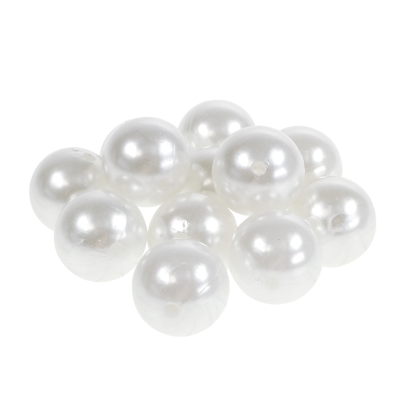 Hver av de hvite dekorative perlene måler rundt 20 millimeter i diameter; hullets diameter er rundt 3 millimeter. Du vil motta settet med 12 i en liten plastboks.