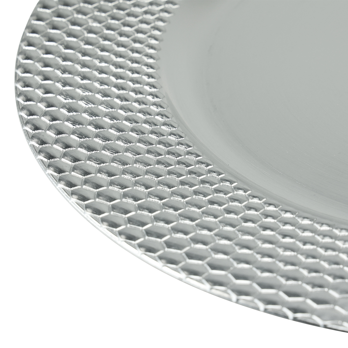 Men det er sekskantmønsteret på kanten som gjør platen til et blikkfang. Sølvfargen gir dekorplaten stor utstråling. Undersiden forblir ubehandlet i svart.