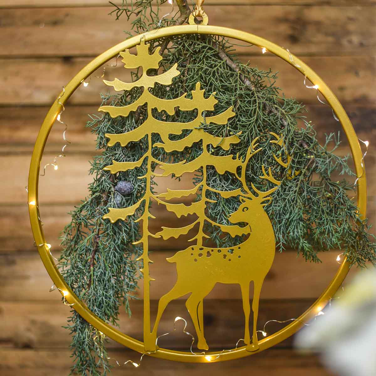 Pyntringen i gull for oppheng viser et juleskogsmotiv med rådyr og grantre. Metalldekorasjonen til jul består av en ring med et øye for oppheng. Filigranmotivet med silhuetten av to grantrær og hjorten eller reinen er nøyaktig kuttet ut og den matte gullfargen gir julepynten en eksklusiv og varm teft på samme tid.