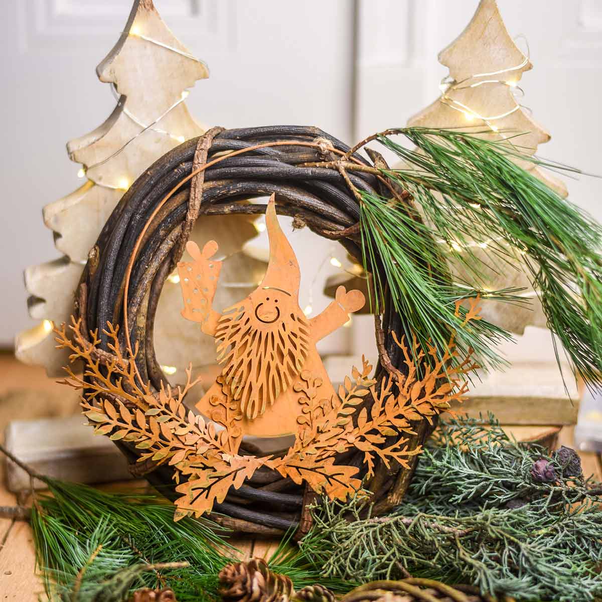 Dekorring til jul, reinsdyr i ringen, julenisse med gave, metalldekor patina Ø18cm sett med 2 stk.