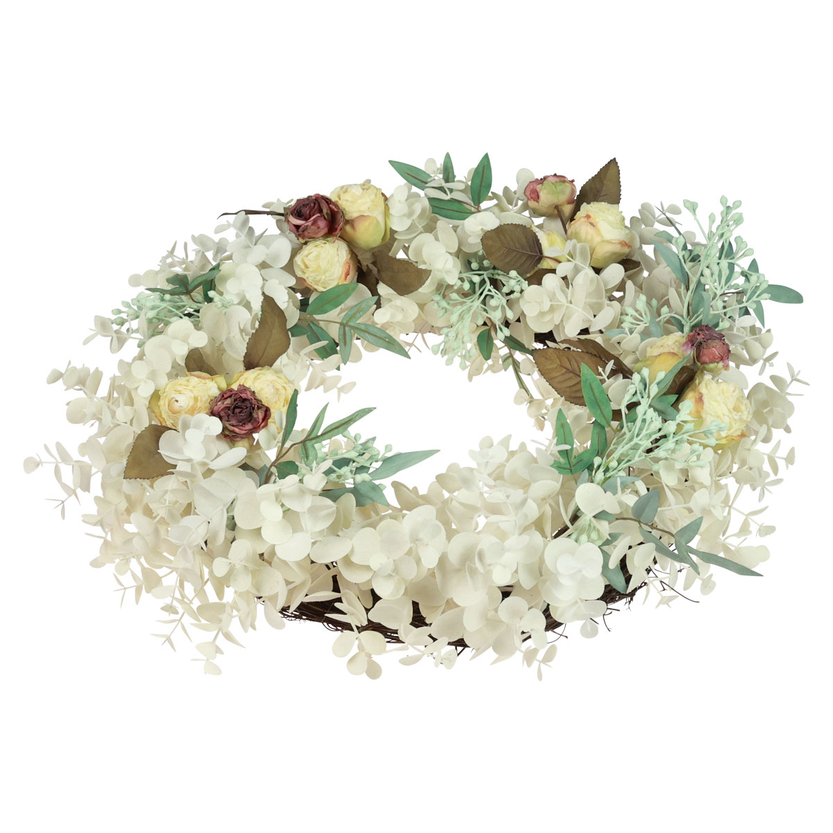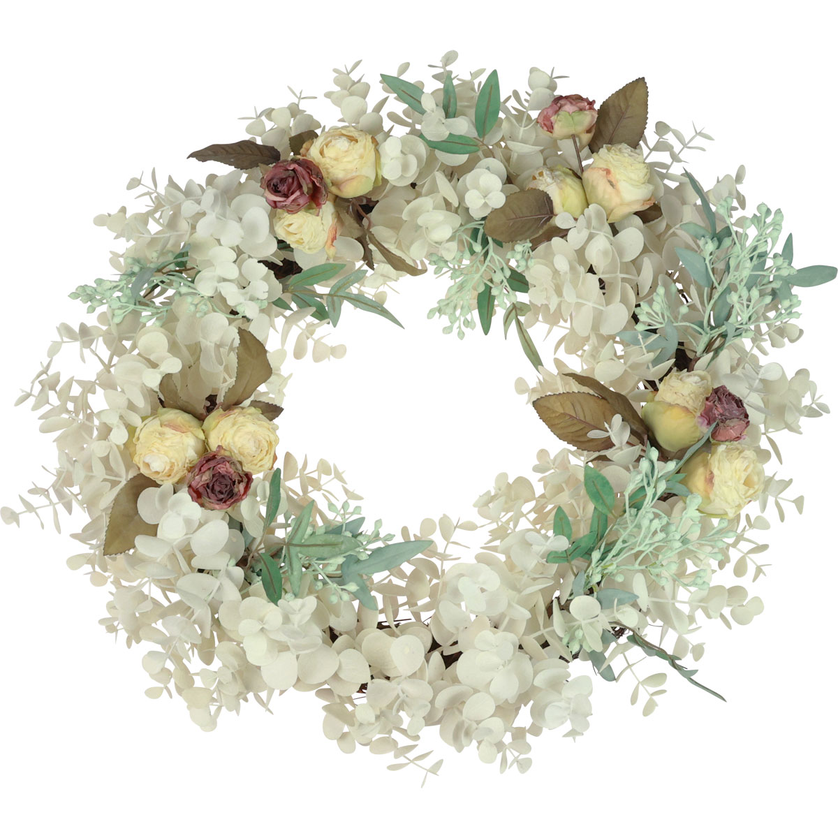 Kransen med eukalyptus og kunstige roser har en total diameter på cirka 50 centimeter. – Du kan også finne andre kunstige kranser i andre design samt kranser med bevarte eukalyptusblader i vårt store sortiment!