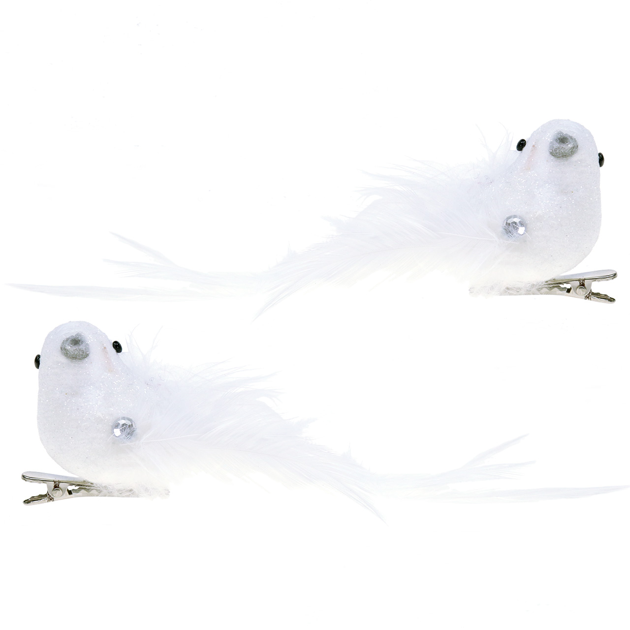 Duene er laget av hvit styrofoam med glitter og ekte fjær og har nebb og øyne laget av plast. Klippet på bunnen er laget av metall. Duene leveres i et sett med 2, laget like og hver omtrent 14 x 4 x 4 centimeter i størrelse.