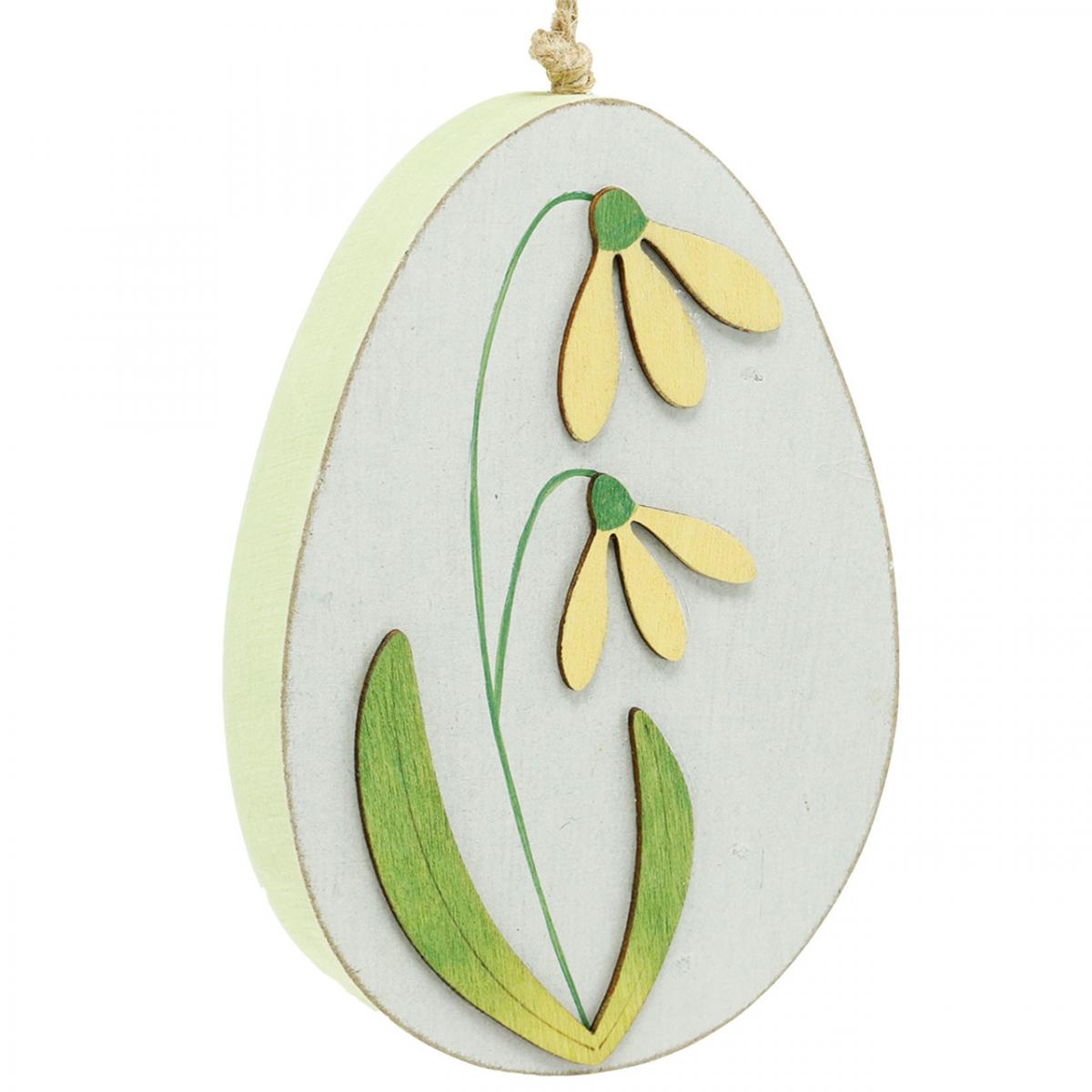 Produktnavn: Egg til å henge, påskeegg av tre, blomstermotiv, løvetann snøklokke Winterling H14cm 3stk