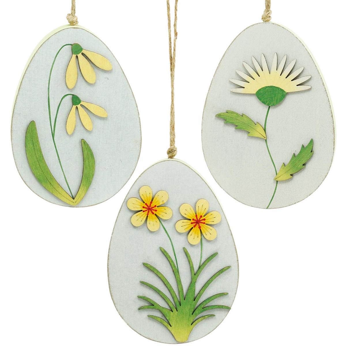 Egg til å henge, påskeegg av tre, blomstermotiv, løvetann snøklokke Winterling H14cm 3stk