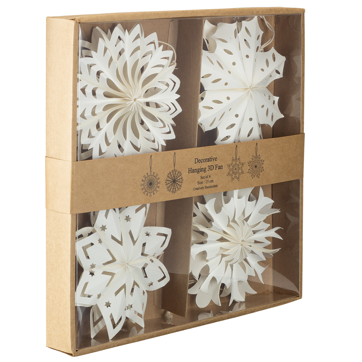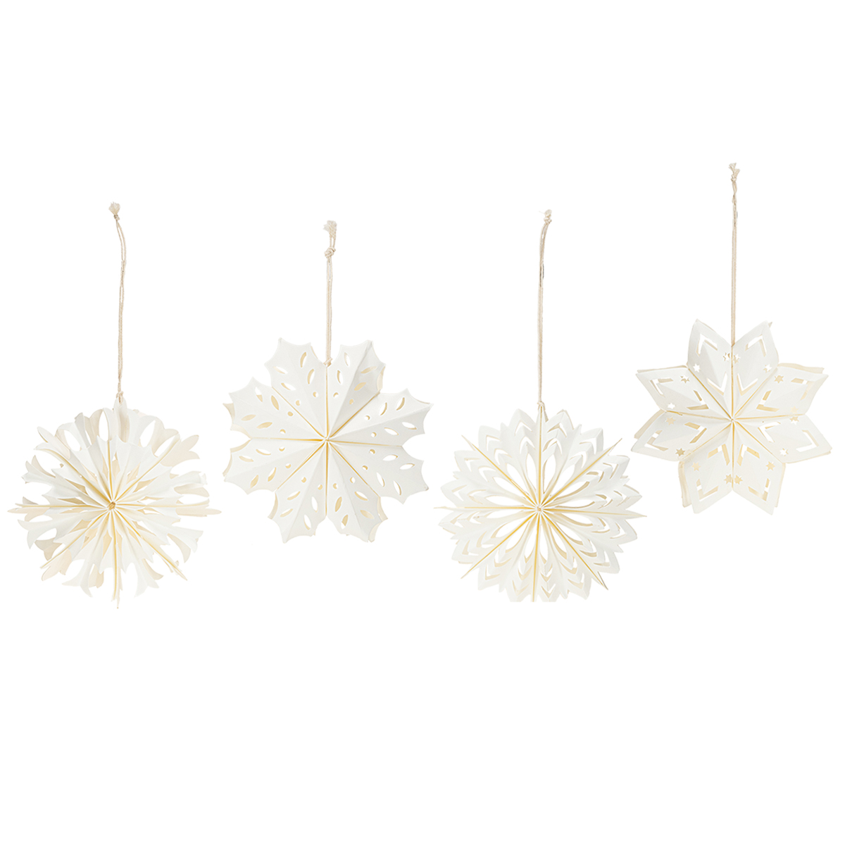 Våre dekorative snøflak av papir kombinerer stil, enkelhet og praktisk bruk. Settet inneholder fire forskjellige snøflak, hver med et åpent mønster som minner om det unike utseendet til ekte snøflak. De er laget av tykt papir av høy kvalitet og gir stabilitet og et elegant utseende. Det er enkelt å henge dem opp med den medfølgende bomullssnoren, og takket være den nøytrale hvite fargen passer snøflakene til nesten enhver dekorasjonsstil.