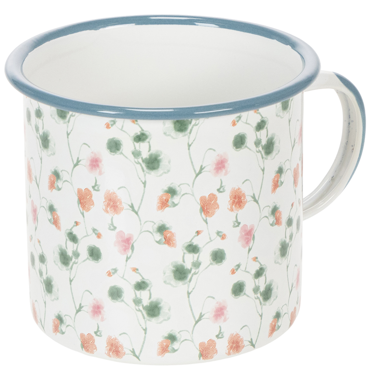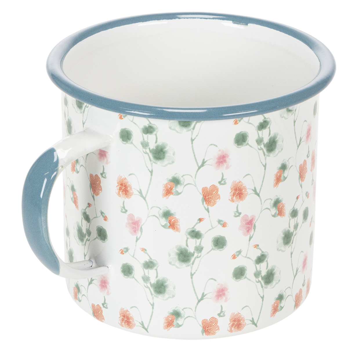 Det hvite dekorative kruset har en blå kant og en blå fargeklatt på håndtaket. Koppen er dekorert rundt med et mønster av grønne blomsterstilker og røde og rosa blomster.