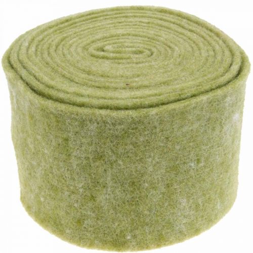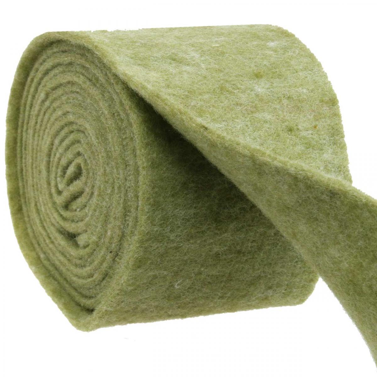 Det mosegrønne filtbåndet, laget av 100% saueull, er viklet inn i en praktisk rull. Den måler omtrent 5 meter i lengden og omtrent 15 centimeter i bredden.