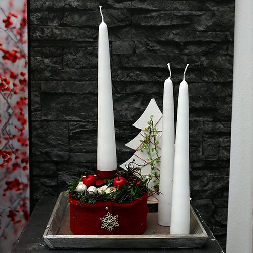 Du kan for eksempel pakke en stråkrans med stoffbåndet og bruke den som grunnlag for en adventskrans. Du kan også bruke et grønt filtbånd for eksempel for å skape en stemningsfull julestemning. Dette fungerer også som en overflate for en vinduskant eller et spisebord. Legg deretter en lysestake, en tallerken med julepynt eller en nydelig julekrans på!