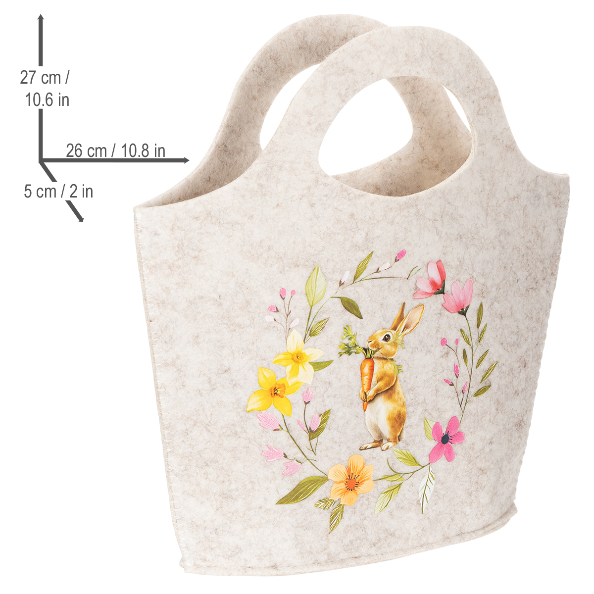 Med sine harmoniske blomstermønstre og muntre kanin er denne filtvesken ikke bare iøynefallende, men også ekstremt praktisk. Den har et enkelt, naturlig design i en skandinavisk stil som er både moderne og koselig. Med en høyde på 27 cm, en diameter på 26 cm og en bredde på 5 cm, tilbyr den god plass til påskeegg, små gaver eller sesongens blomsteroppsatser. De praktiske håndtakene gjør den til en ideell følgesvenn, enten det er for en piknik i hagen, en påskeeggjakt eller en tur til bondens marked.