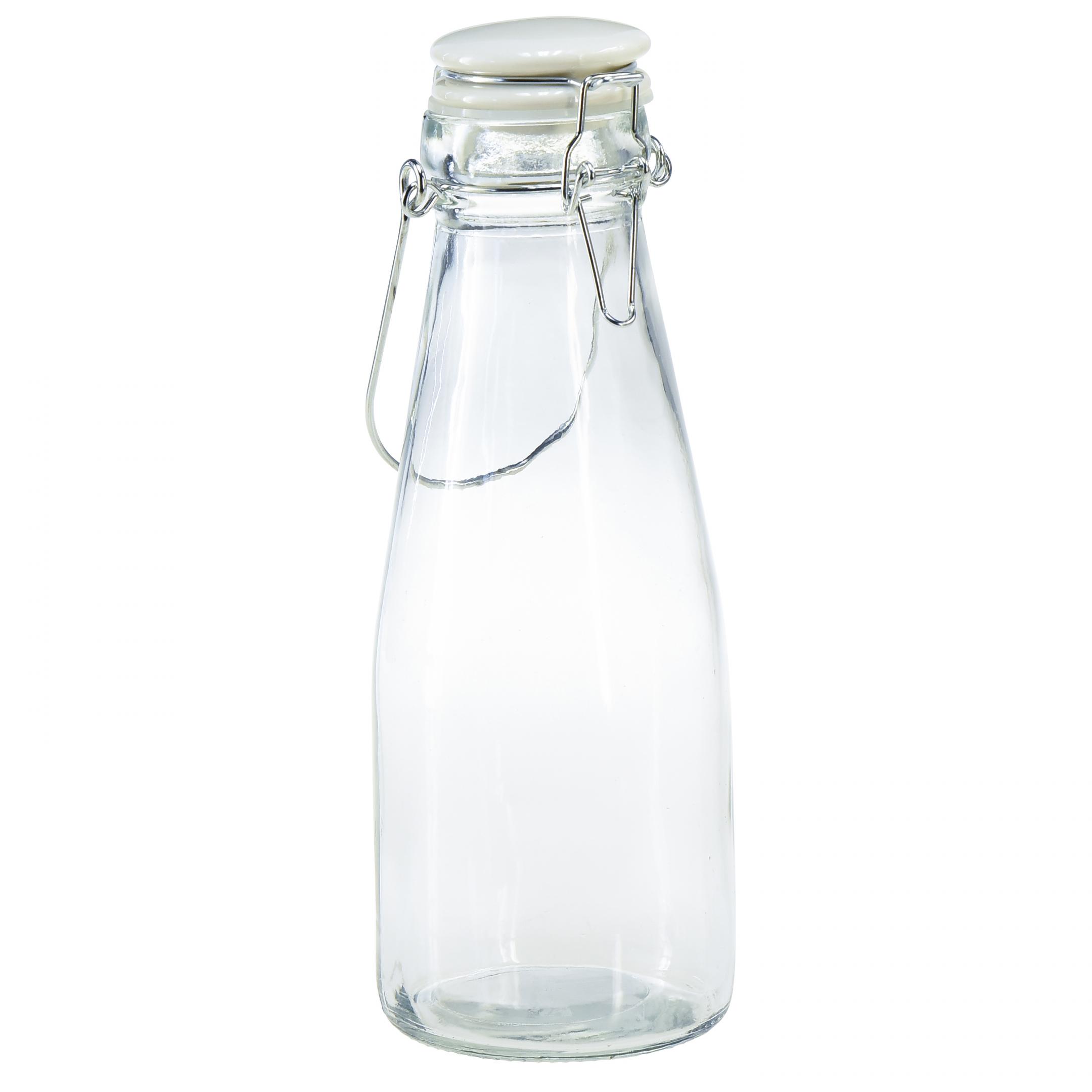 Flasken leveres med en kork av keramikk og metall. Selve flasken er laget av glass og har en total høyde på omtrent 24 centimeter.