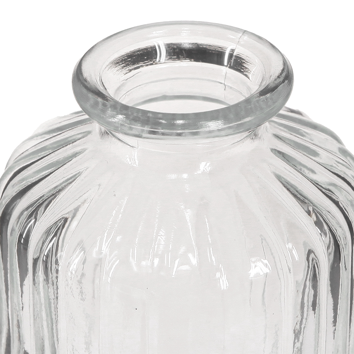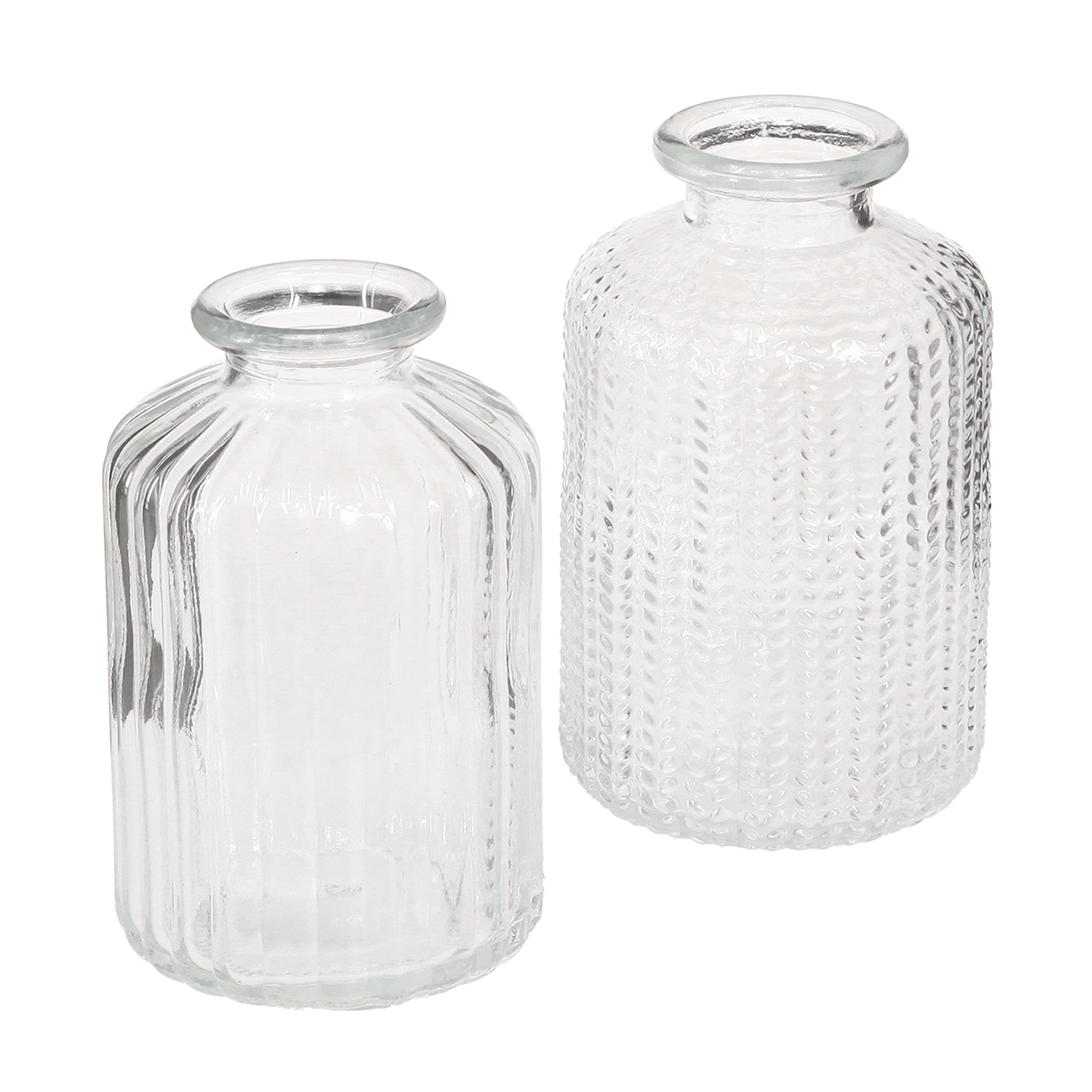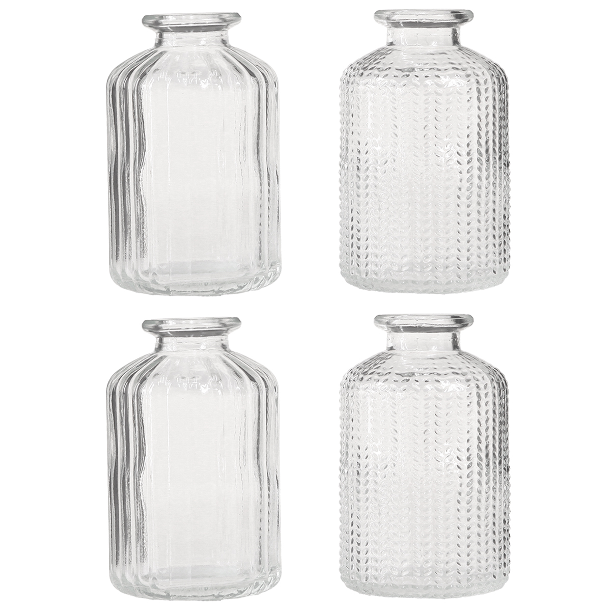 Hver av de fire dekorative glassflaskevasene er ideelle som stilige plantekasser og sjarmerende retro minivaser. Designet i et elegant gjennomsiktig utseende, hver med en attraktiv skala eller rilledekor, passer de sømløst inn i enhver innredningsstil. Enten det er boho, landsted eller shabby chic, setter disse små glassvasene sjarmerende aksenter i interiøret ditt som vintage tilbehør til hjemmet.
