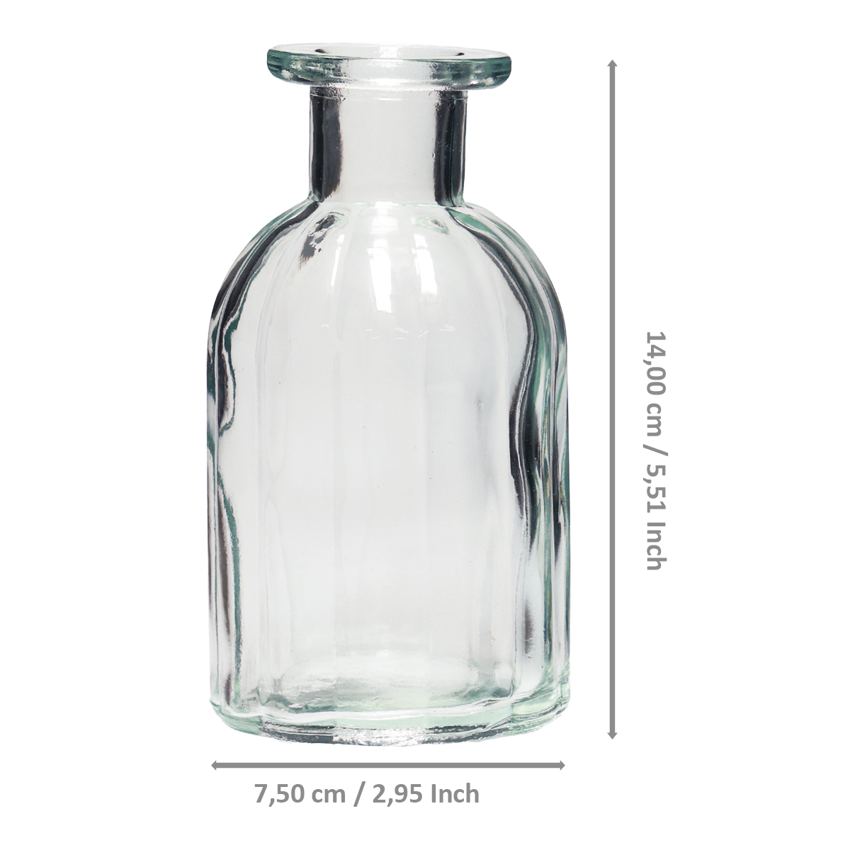 I vår butikk kan du også finne flaskevasen i en større utgave. Den lille glassvasepynten er rundt 14 centimeter høy og har en diameter på rundt 7,5 centimeter.