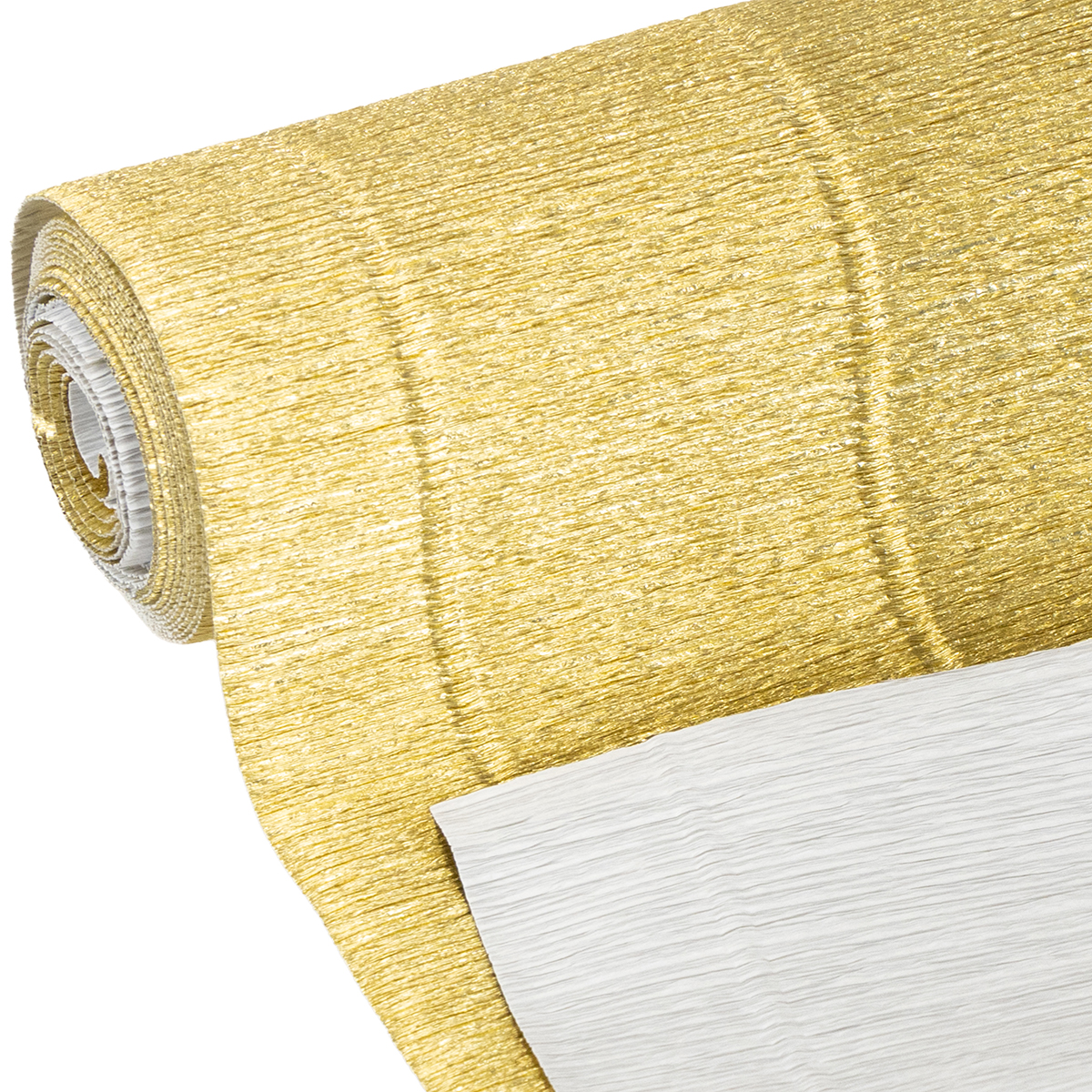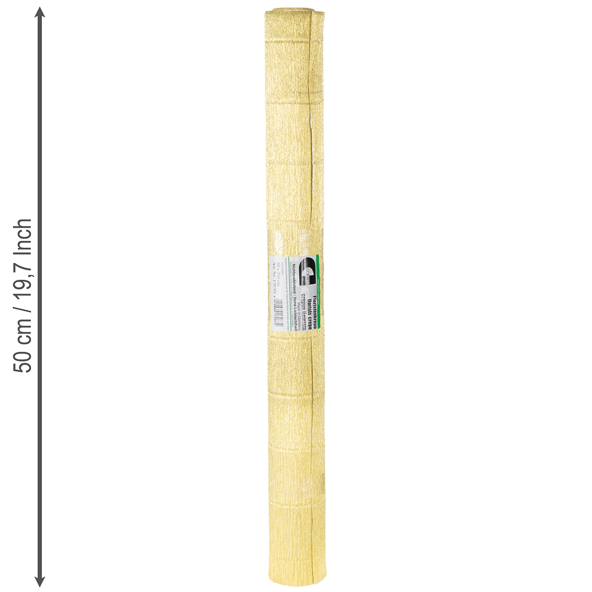 Blomsterhandler crepe papir i gull er viklet inn i en rulle og har en hvit innside. Med en størrelse på rundt 50 x 250 centimeter kan du finpusse både store og små dekorasjoner.