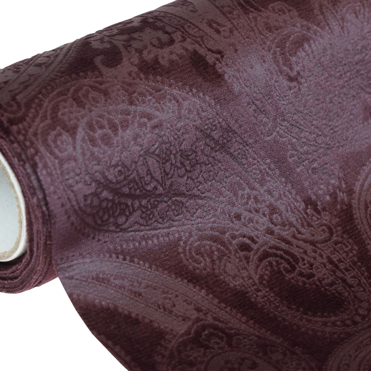 Det vakre stoffet føles som fløyel og er preget med et detaljert paisleymønster. Mens fløyelsbåndet skimrer i aubergine, fremstår mønsteret litt lysere og skiller seg derfor spesielt godt ut i lyset.
