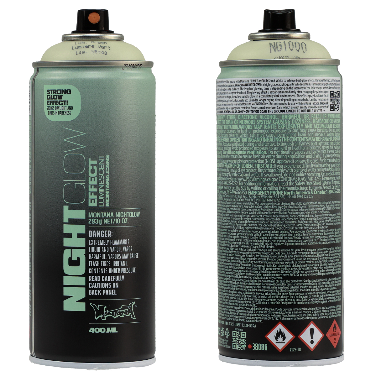 Den fluorescerende fargen Nightglow som effektspray fra Montana Cans har en uhyggelig vakker grønntone, men den fluorescerende fargen er også tilgjengelig i oransje i vår butikk.