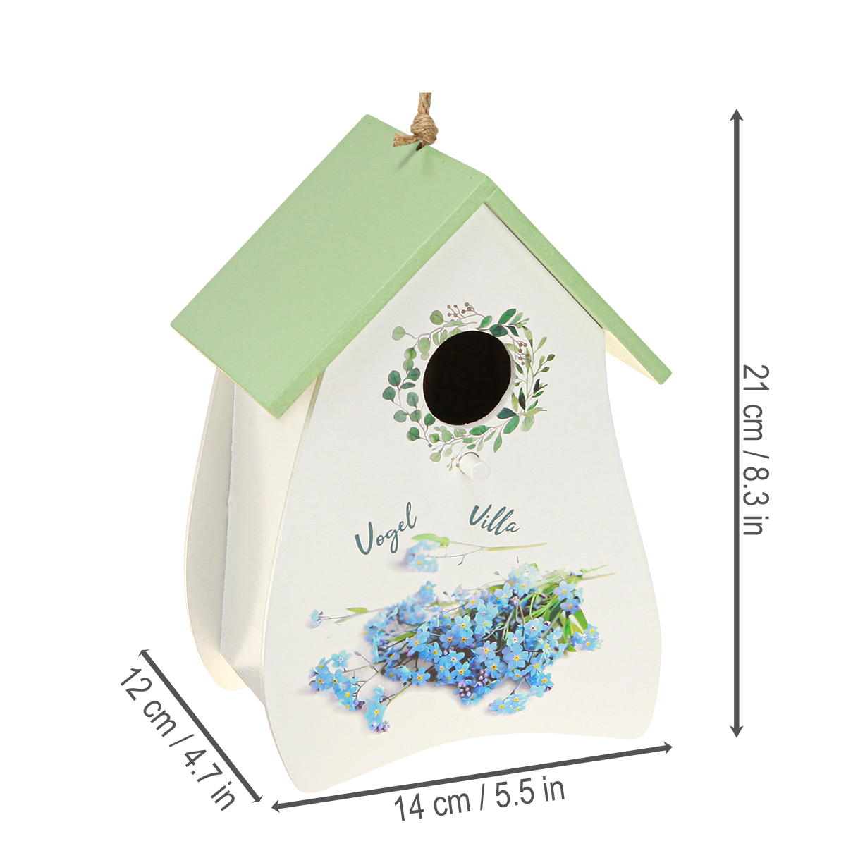 Dette fuglehuset er ikke bare et dekorativt element; det er en liten skatt for alle som setter pris på sjarmerende detaljer. Takets friske grønnfarge harmonerer perfekt med den myke hvitfargen på trefasaden, utsmykket med delikate blomstermotiver. Det fremkaller sjarmen til koselige landsteder og blander seg sømløst inn i vintage- eller rustikk innredning. Med en høyde på 21 centimeter ser det flott ut på enhver vinduskarm eller vegg, og trekker umiddelbart blikket. Det beste av alt? Det er rent dekorativt, noe som gjør det ideelt for innendørs bruk. Det kjærlige håndverket er tydelig tydelig, noe som gjør hvert fuglehus til et unikt stykke. Det er spesielt herlig om våren og sommeren: plasser det foran en vase med friske blomster eller legg til dette sjarmerende preget på vårborddekningen. Og la oss være ærlige, hvem elsker ikke litt mer blomsterskjønnhet og naturlige elementer i hjemmet sitt? Pusse opp er en lek: bare åpne baksiden, legg til små tilbehør eller blomsteroppsatser, og det stråler umiddelbart med et friskt nytt utseende. Fuglehuset er også en flott idé som en spesiell gave, fordi det er individuelt, praktisk og tidløst vakkert.